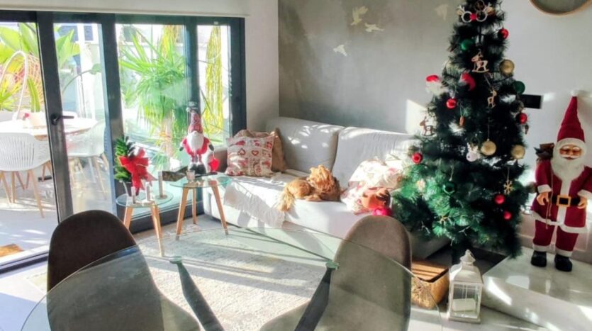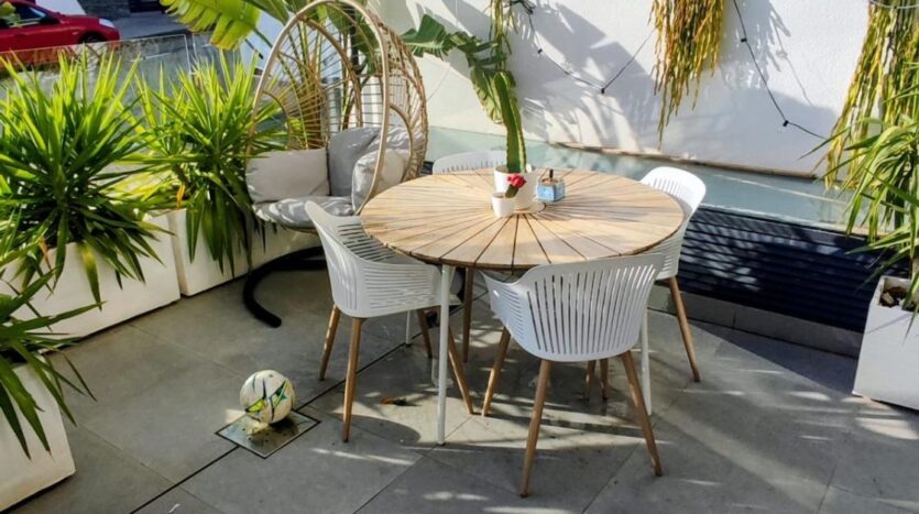 En la planta baja se accede a través de una amplia terraza exterior, ideal para disfrutar del clima mediterráneo. En su interior encontramos un espacioso y luminoso salón-comedor, un aseo de cortesía y una cocina completamente equipada, diseñada con materiales de alta calidad. Desde esta planta se accede también a un patio interior donde se ubican la lavadora y el termo eléctrico, aportando funcionalidad y espacio adicional.