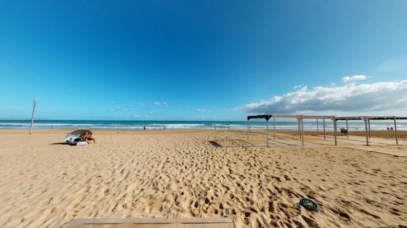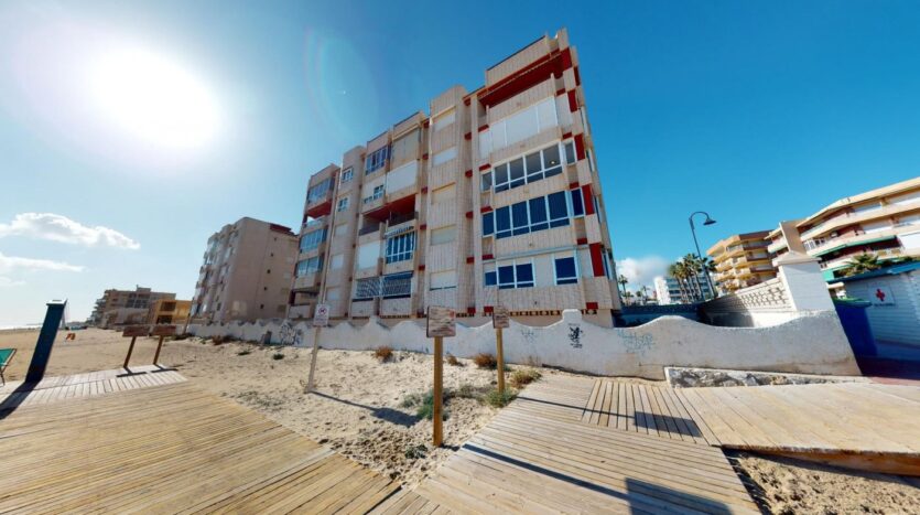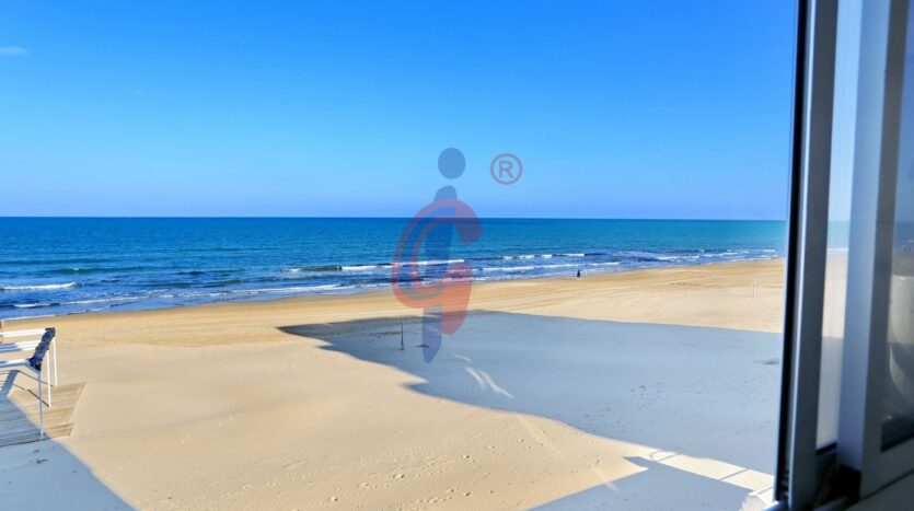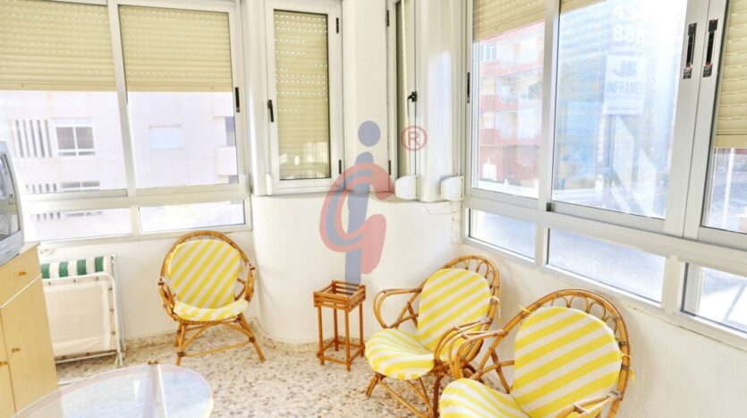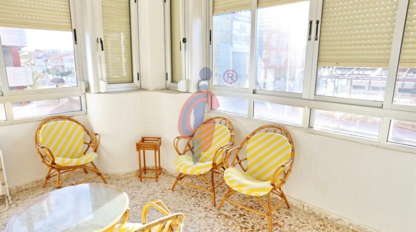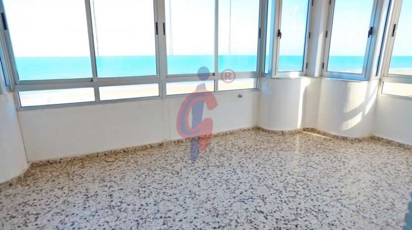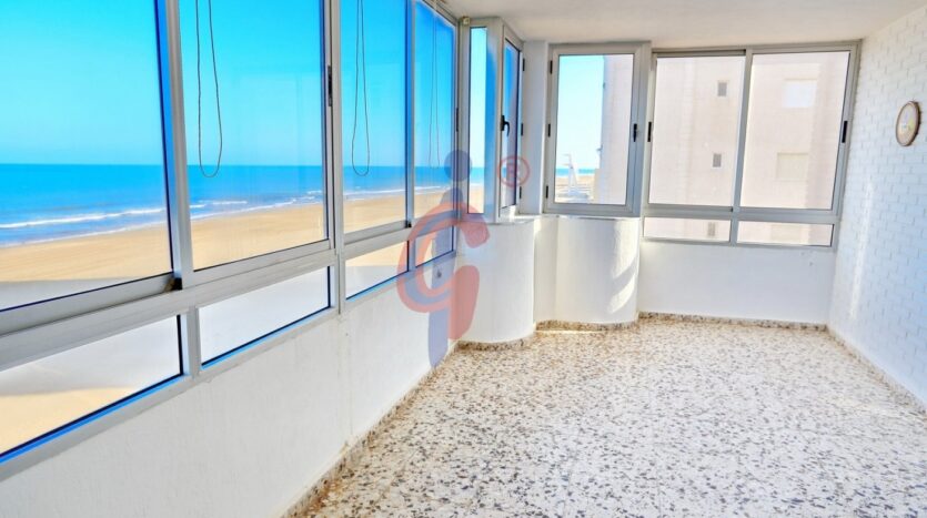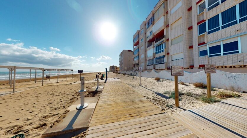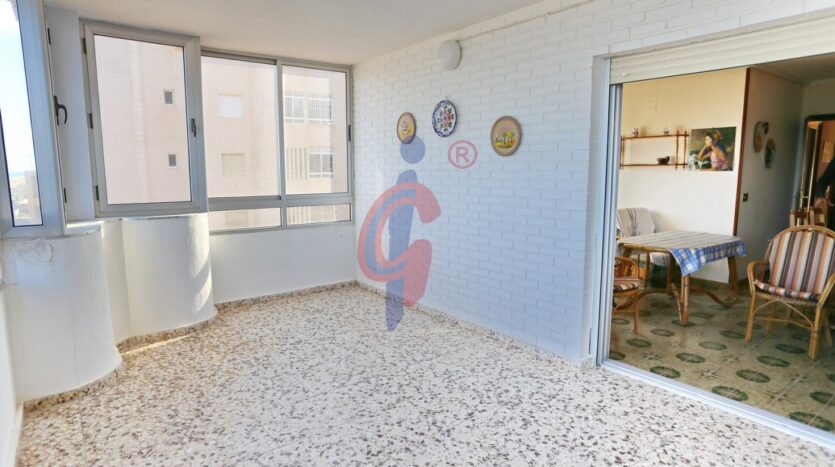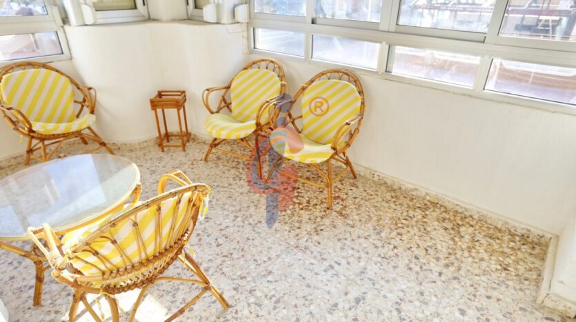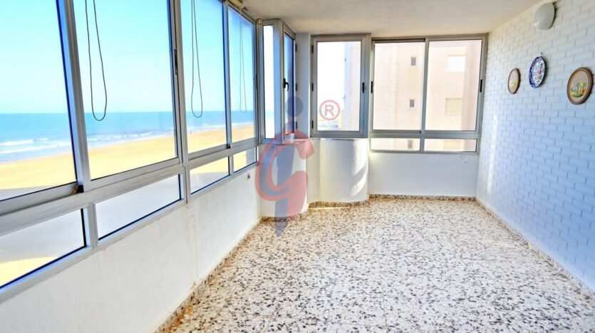 – Terraza acristalada en esquina orientada al sur y al este tiene unas impresionantes vistas a la playa, ya que se encuentra ubicado casi en la misma arena, desde el bloque tiene salida directa a la playa sin tener que cruzar ni tan solo una carretera. Desde todos los puntos del salón terraza se puede ver el mar y la playa.