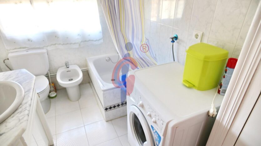 – Cuarto de baño completo con bañera, lavabo, bidet, inodoro y ventana al exterior.