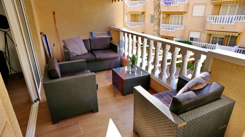 El apartamento cuenta con dos terrazas, una de ellas accesible desde la sala de estar y la otra desde uno de los dormitorios. Ambas terrazas son lugares ideales para relajarse al aire libre, tomar el sol o disfrutar de comidas al aire libre mientras disfrutas de la suave brisa marina.