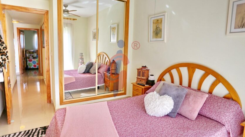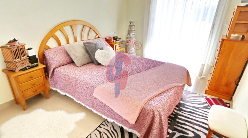 – Habitación principal con cama de matrimonio, dos mesitas de noche, armario empotrado y acceso a la terraza.