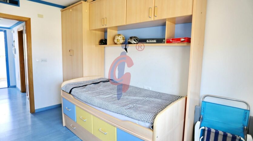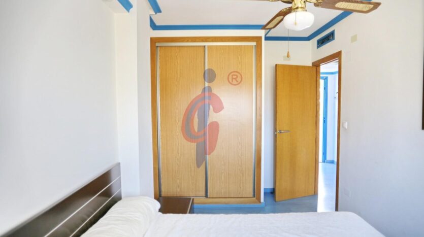 – Dormitorio principal con cama doble y un armario empotrado de cuatro puertas y mueble auxiliar.