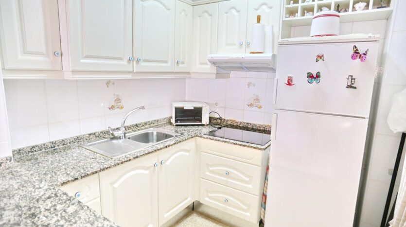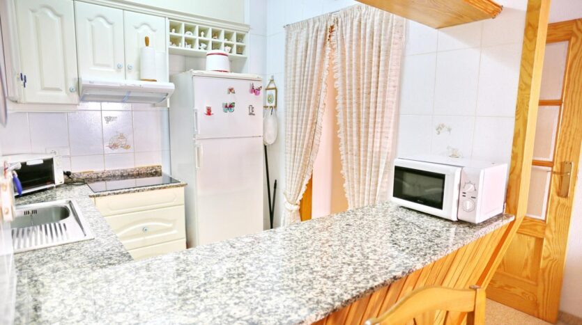 La cocina americana está equipada con una barra ideal para desayunos o comidas rápidas. En la vivienda hay una especie de trastero/galería donde se encuentra el termo y la lavadora, además de espacio adicional para almacenamiento. El amplio salón-comedor es perfecto para relajarse o entretener a los invitados, con salida a una terraza espaciosa con capacidad para mesa y 4 o 6 sillas, perfecta para disfrutar del clima mediterráneo.