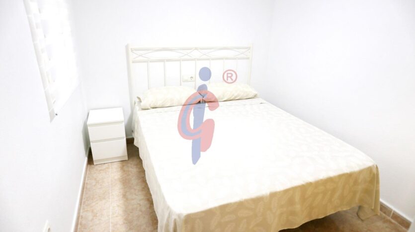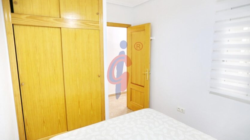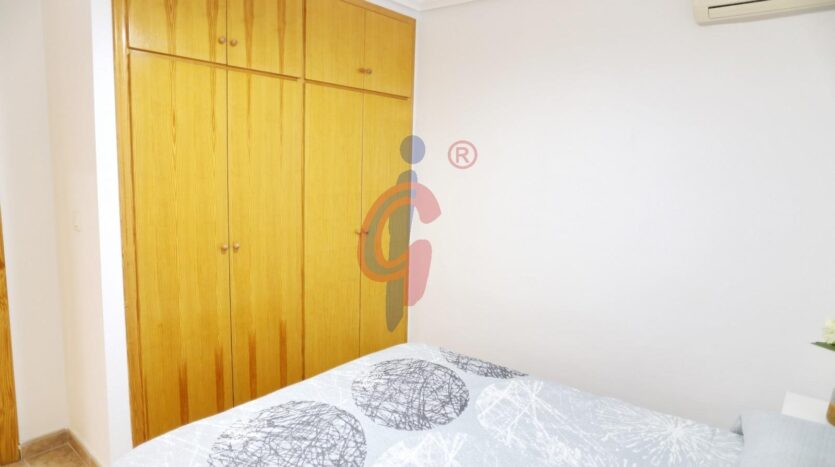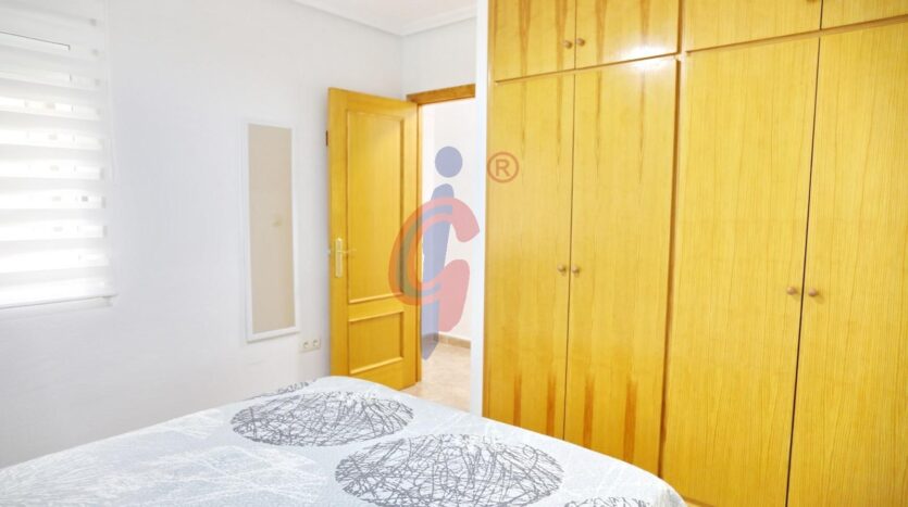 – Dormitorio principal con cama doble y un armario empotrado de cuatro puertas y mueble auxiliar.