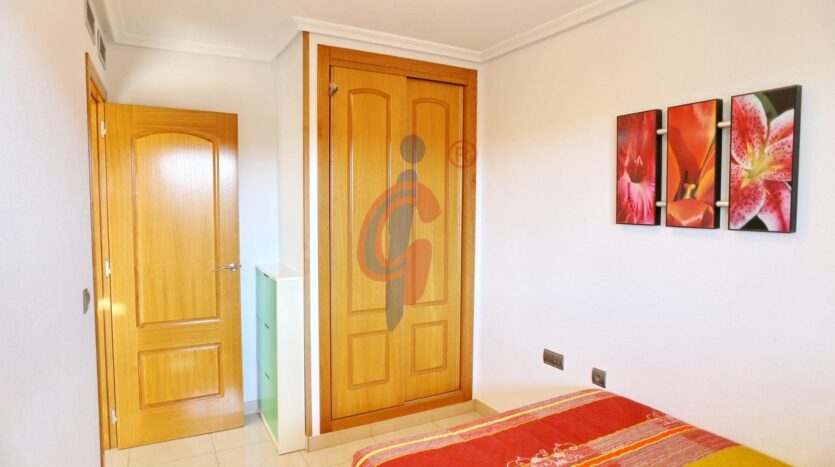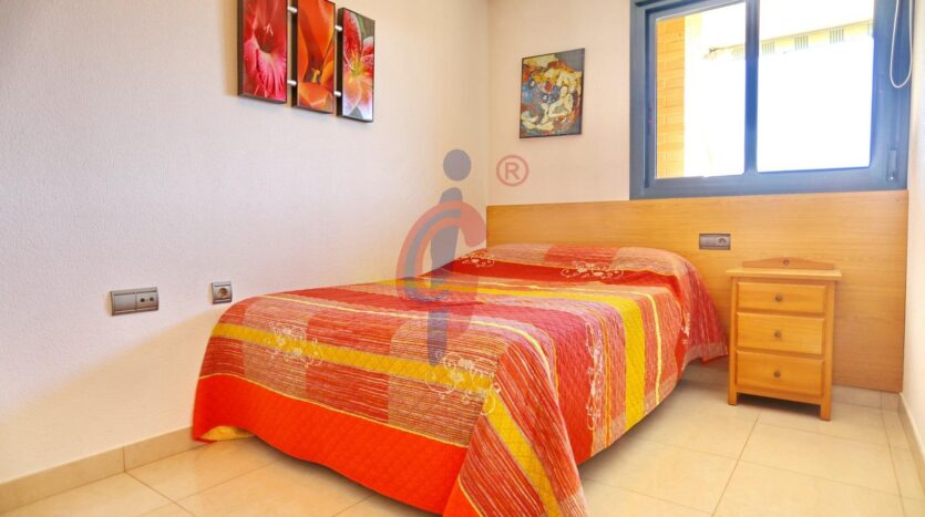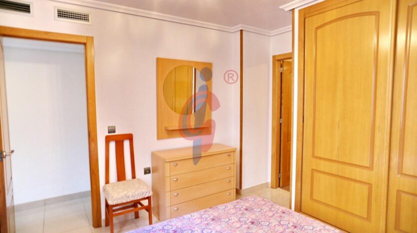 Desde el salón se accede al segundo dormitorio, que cuenta con cama individual, armario empotrado y ventana a la calle.