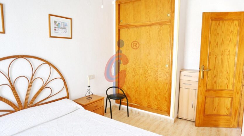 Dormitorio principal: Acogedor y espacioso, con cama de matrimonio, armario empotrado, ventilador de techo y ventana con orientación este.
