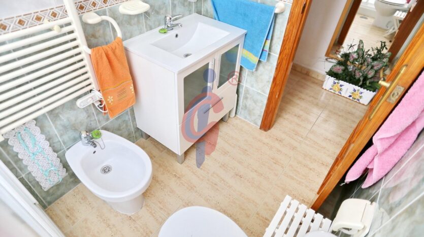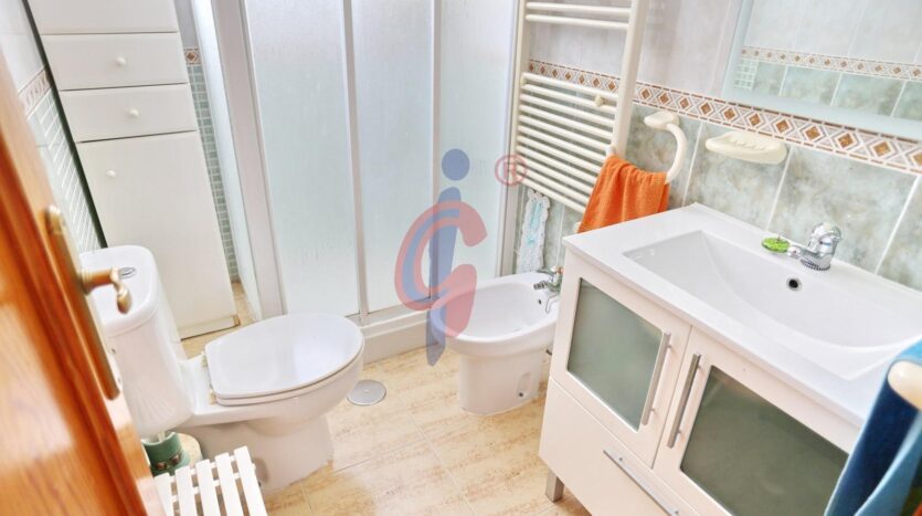 Baño completo: Funcional y cómodo, equipado con plato de ducha, lavabo, inodoro, bidé y mueble auxiliar de almacenamiento.