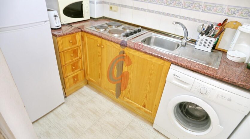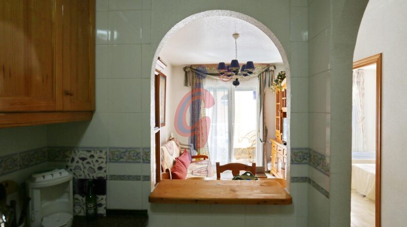 La cocina, semi-independiente, está diseñada de manera práctica y cuenta con una ventana que comunica con el salón, permitiendo la entrada de luz natural y facilitando la ventilación. Está equipada con todos los electrodomésticos necesarios y ofrece suficiente espacio de almacenamiento.
