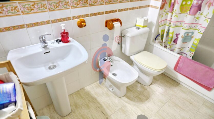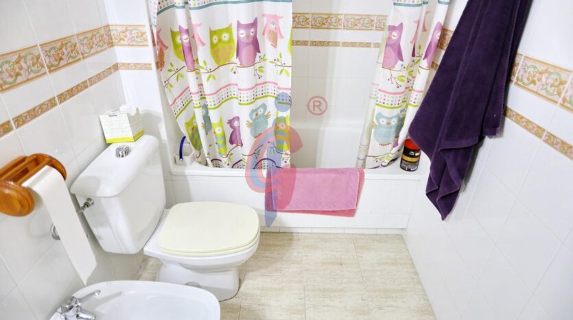 El dormitorio principal es amplio y luminoso, y dispone de un armario empotrado que optimiza el espacio disponible. El cuarto de baño es completo, con bañera, lavabo, inodoro y bidé, y se encuentra en perfecto estado.