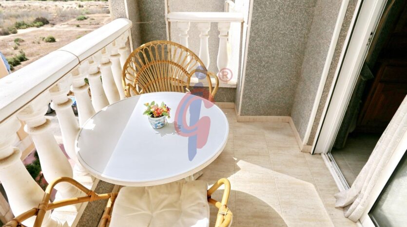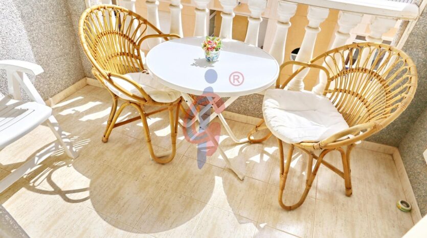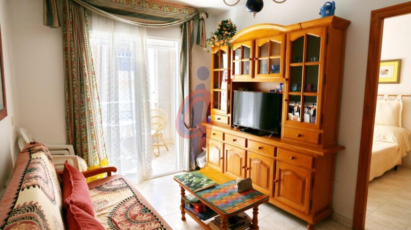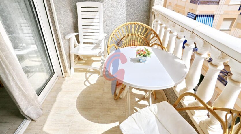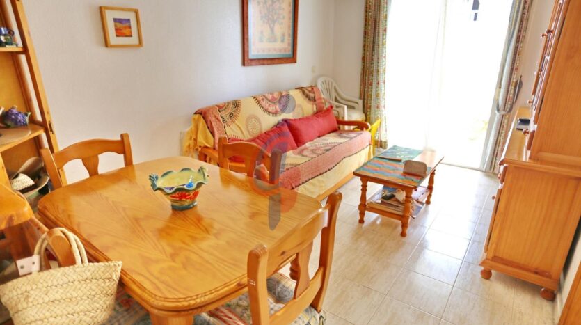 Al acceder, a mano derecha nos recibe un amplio salón-comedor, completamente amueblado. Desde aquí se accede a una agradable terraza con orientación sur, ideal para disfrutar del clima mediterráneo durante todo el año. La terraza cuenta con espacio suficiente para colocar una mesa y cuatro sillas, convirtiéndose en el lugar perfecto para desayunos al sol, cenas al aire libre o simplemente relajarse con vistas al mar.