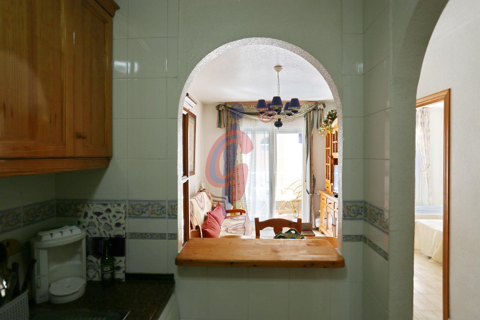 La cocina, semi-independiente, está diseñada de manera práctica y cuenta con una ventana que comunica con el salón, permitiendo la entrada de luz natural y facilitando la ventilación. Está equipada con todos los electrodomésticos necesarios y ofrece suficiente espacio de almacenamiento.