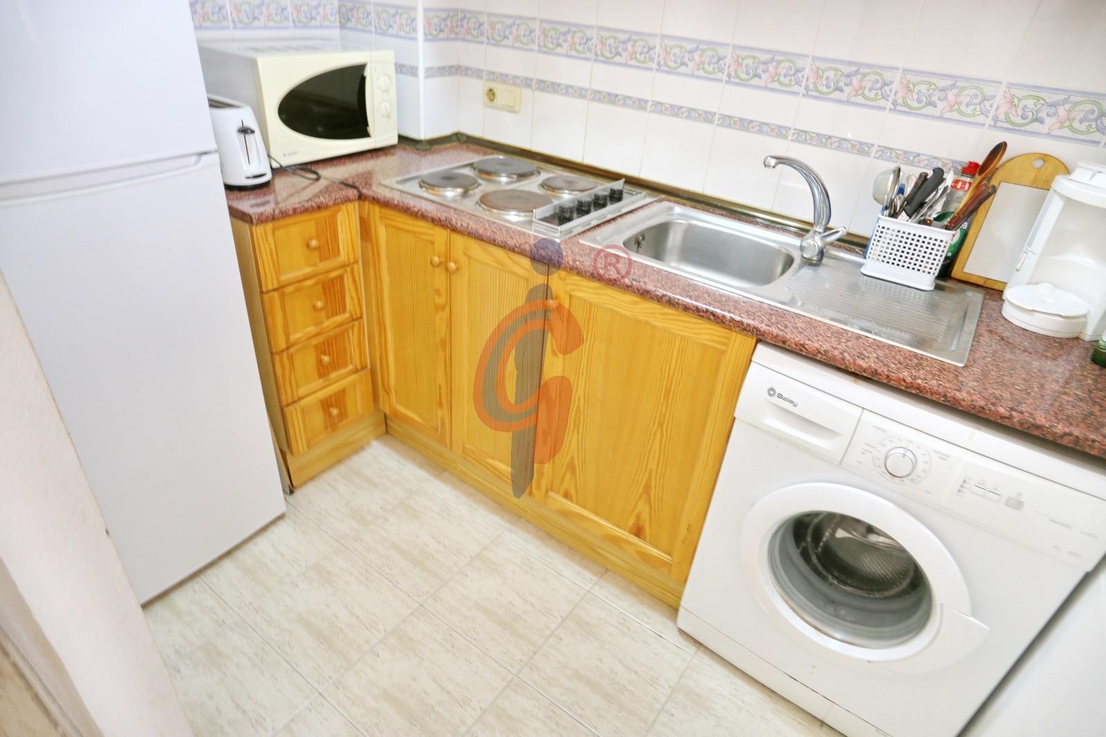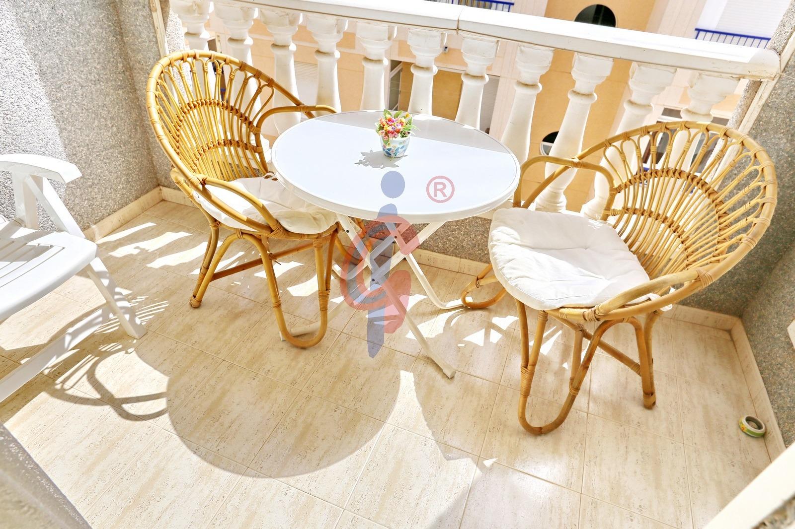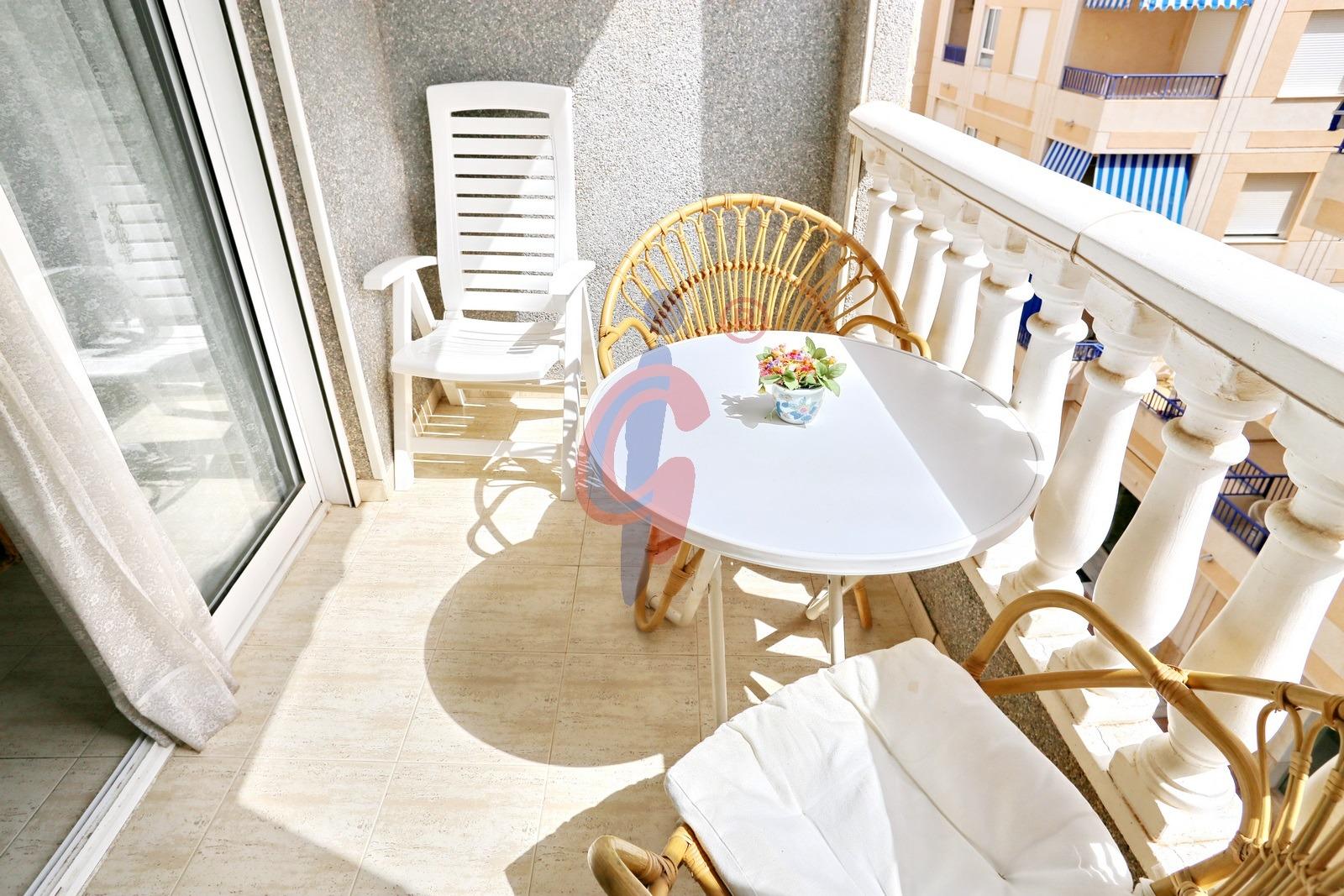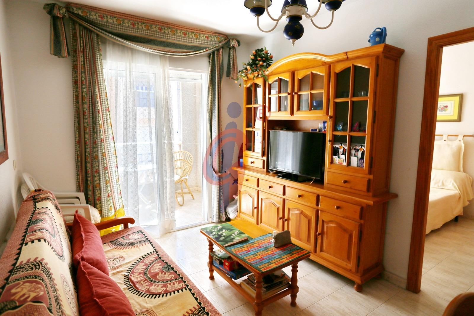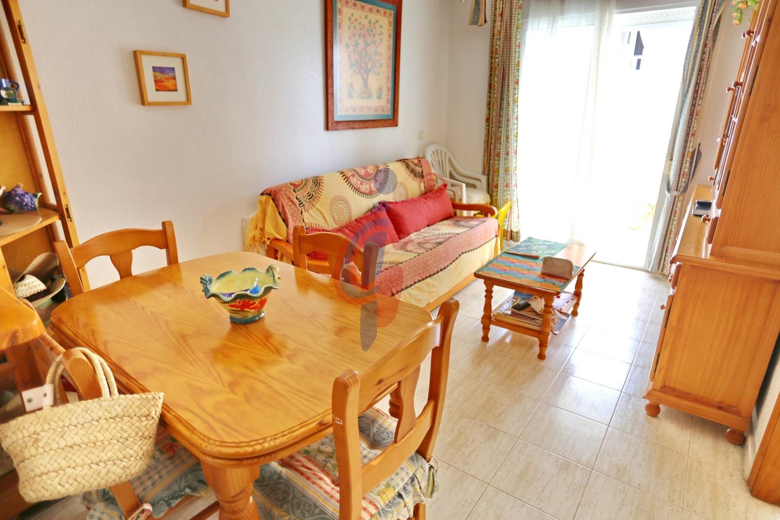 Al acceder, a mano derecha nos recibe un amplio salón-comedor, completamente amueblado. Desde aquí se accede a una agradable terraza con orientación sur, ideal para disfrutar del clima mediterráneo durante todo el año. La terraza cuenta con espacio suficiente para colocar una mesa y cuatro sillas, convirtiéndose en el lugar perfecto para desayunos al sol, cenas al aire libre o simplemente relajarse con vistas al mar.