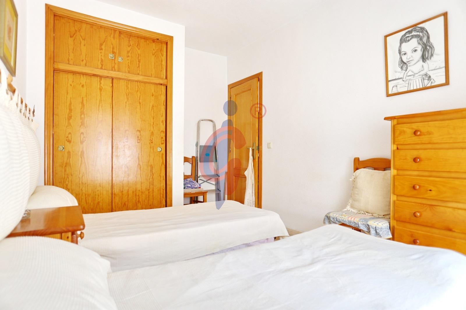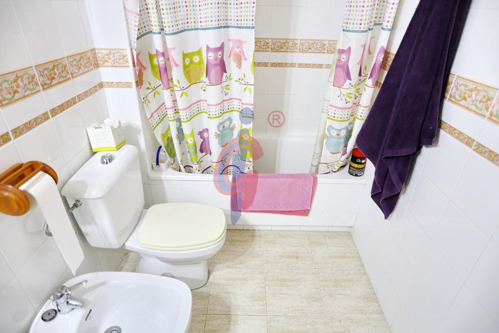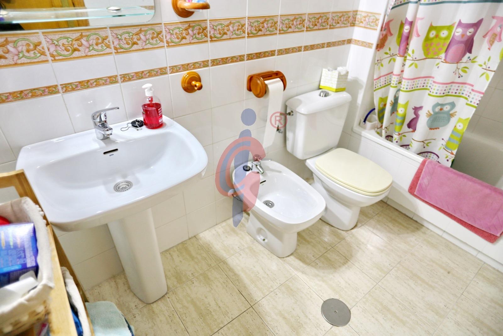 El dormitorio principal es amplio y luminoso, y dispone de un armario empotrado que optimiza el espacio disponible. El cuarto de baño es completo, con bañera, lavabo, inodoro y bidé, y se encuentra en perfecto estado.