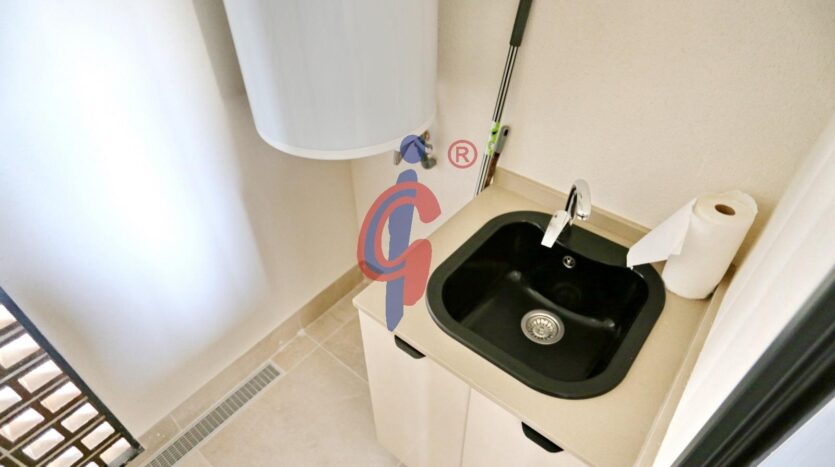La urbanización, totalmente cerrada, dispone de amplias zonas comunes que incluyen una gran piscina comunitaria rodeada de césped artificial, duchas exteriores, y zonas de descanso. La propiedad incluye además una plaza de aparcamiento en superficie y un amplio trastero ubicado en el sótano del edificio.