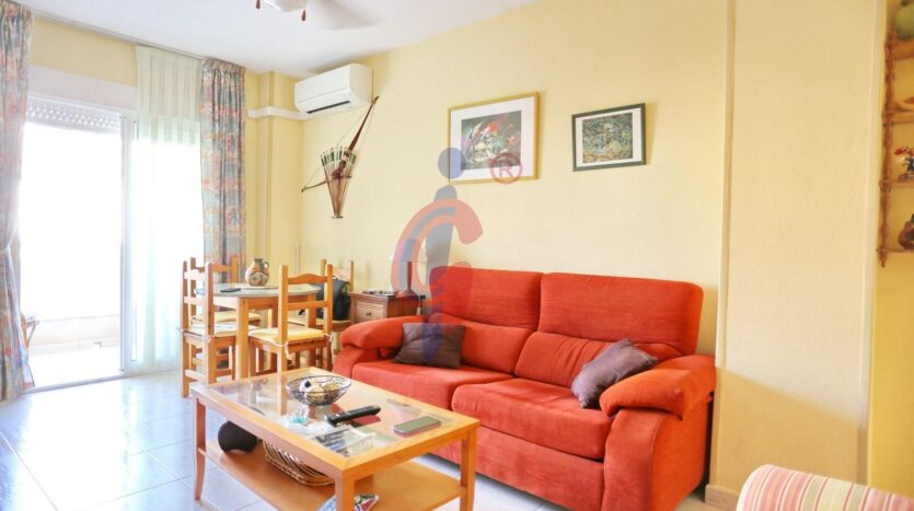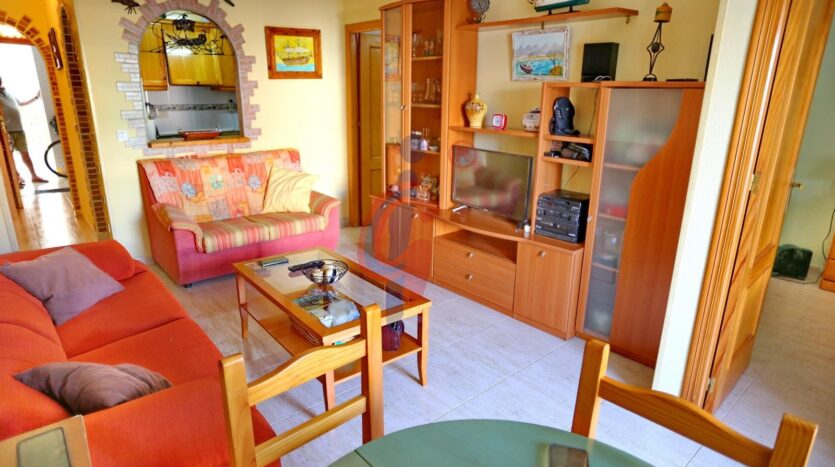 La vivienda dispone de un amplio y cómodo salón-comedor, equipado con aire acondicionado, ventilador de techo, dos sofás y mesa de comedor, perfecto para relajarte o recibir visitas. Desde el salón se accede a una agradable terraza con espacio para mesa y sillas y con toldo instalado, ideal para disfrutar del aire libre con vistas despejadas.