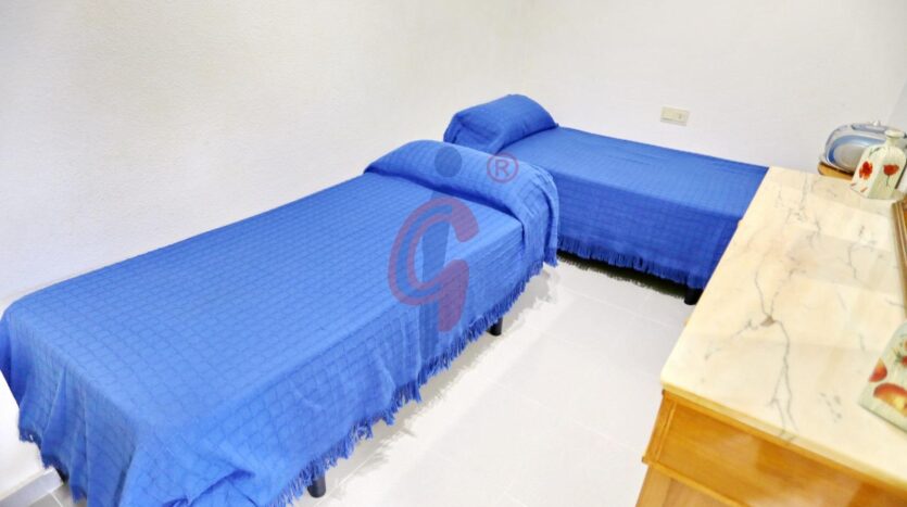 El dormitorio principal cuenta también con acceso directo a la terraza, dispone de una cama de matrimonio y armario empotrado. El segundo dormitorio ofrece dos camas individuales, armario empotrado y una ventana orientada al patio interior, lo que garantiza un ambiente tranquilo y fresco.