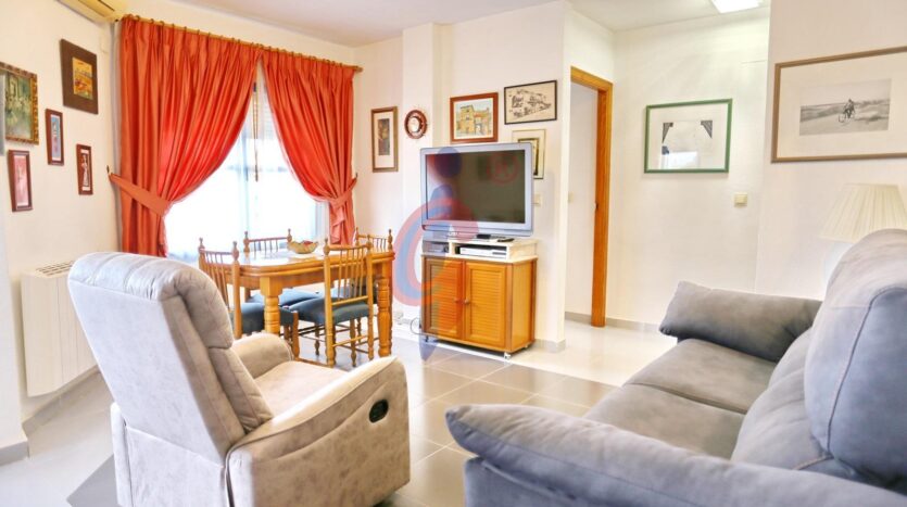 El salón-comedor, amplio y luminoso, se entrega completamente amueblado y da paso a una agradable terraza con vistas laterales al mar, perfecta para relajarse al aire libre.