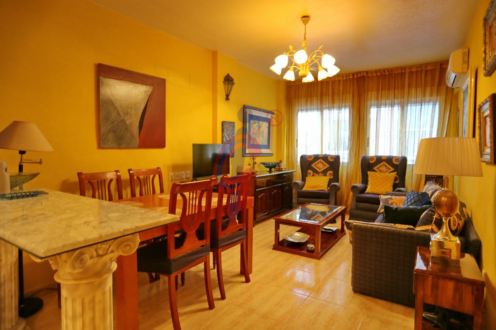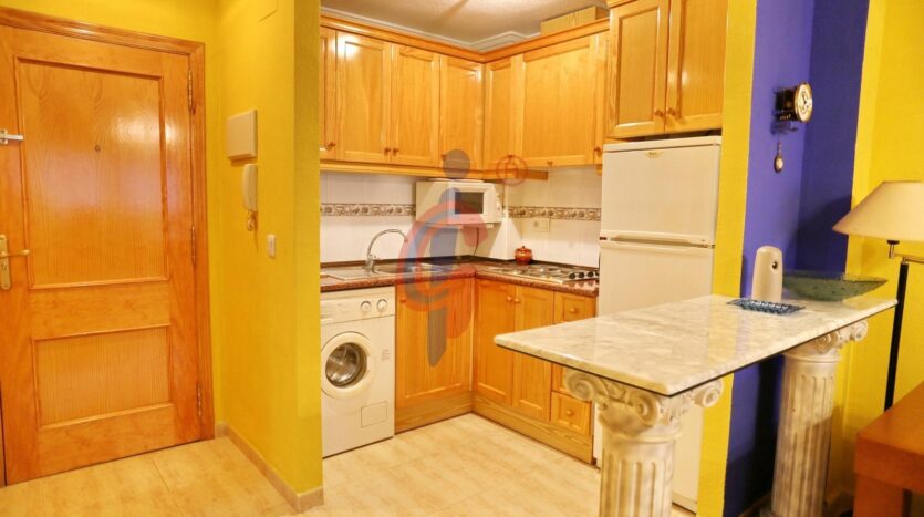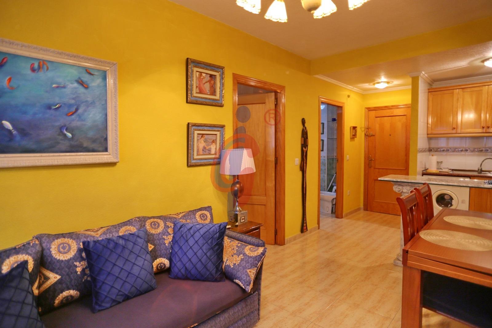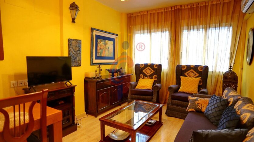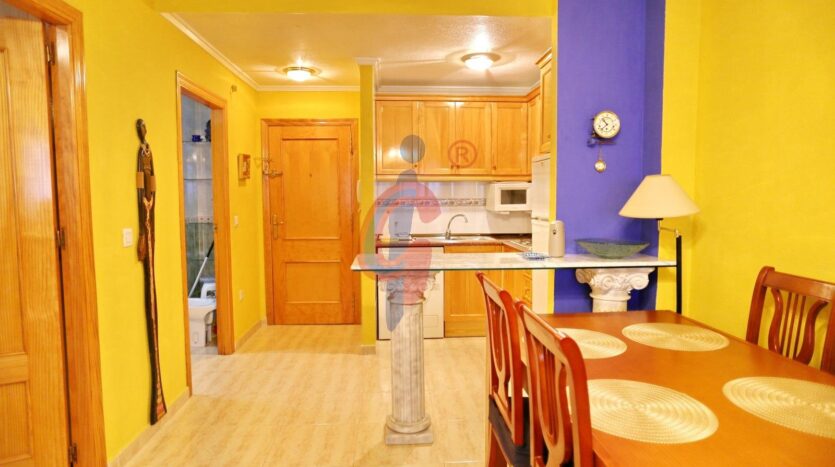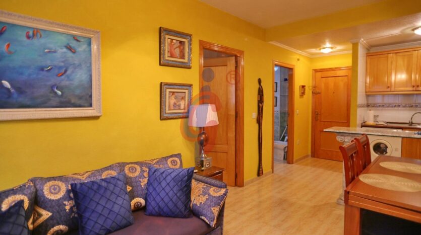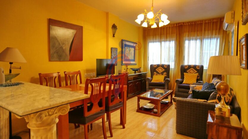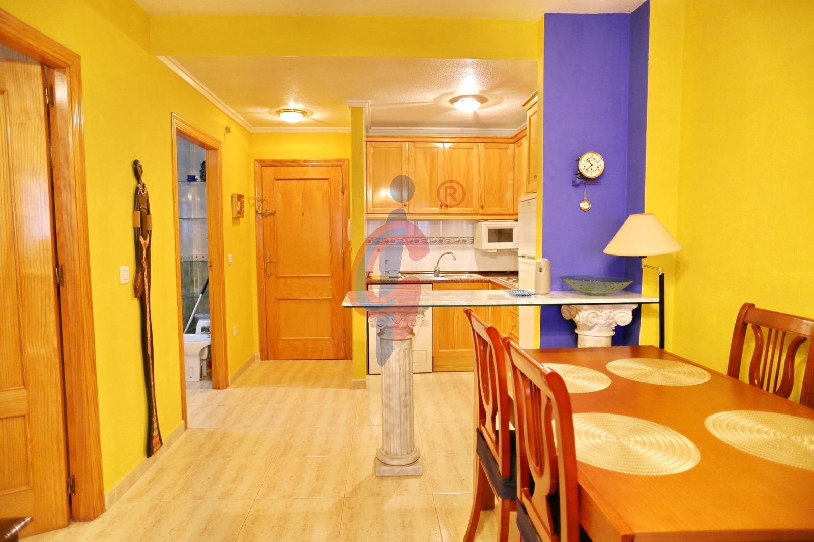 La propiedad cuenta con una distribución práctica y funcional. Al acceder encontramos un salón-comedor totalmente amueblado, equipado con aire acondicionado split en pared y con cocina americana integrada, completamente equipada con electrodomésticos.