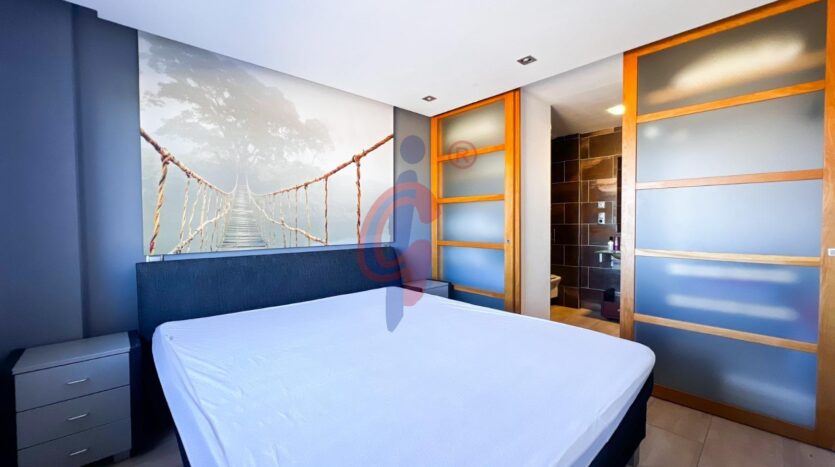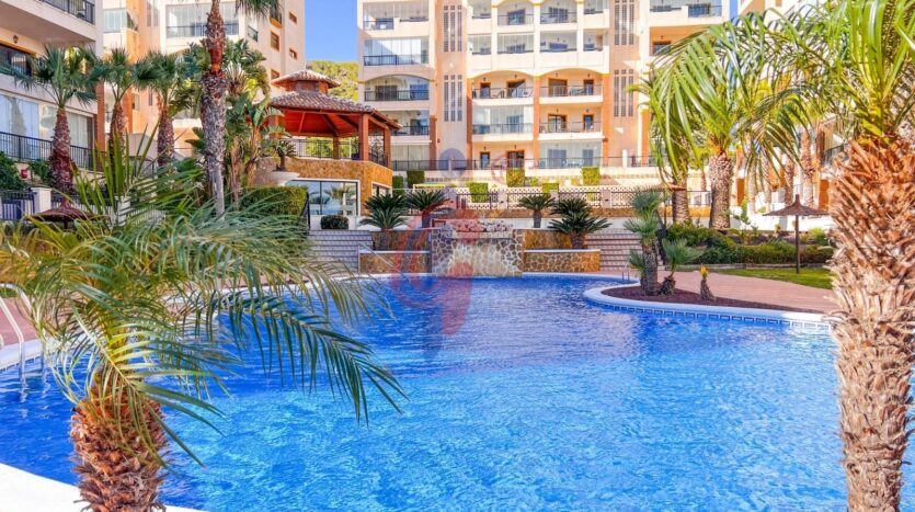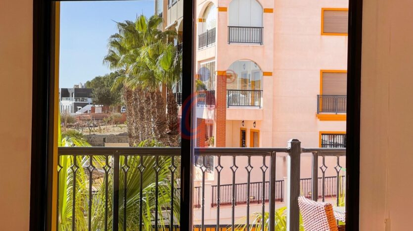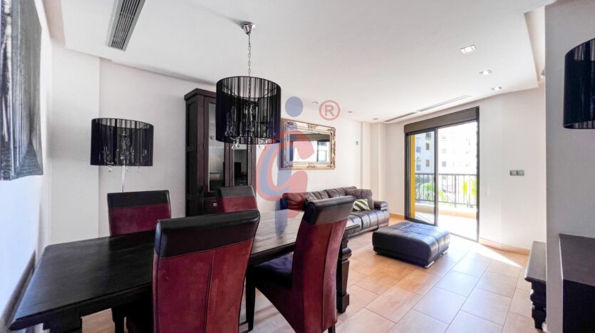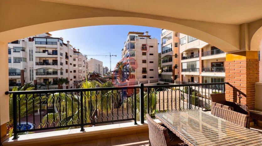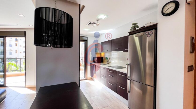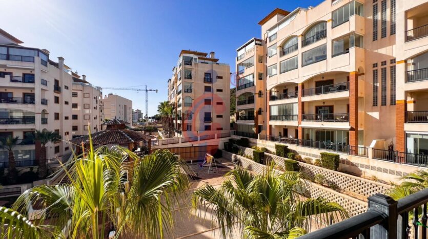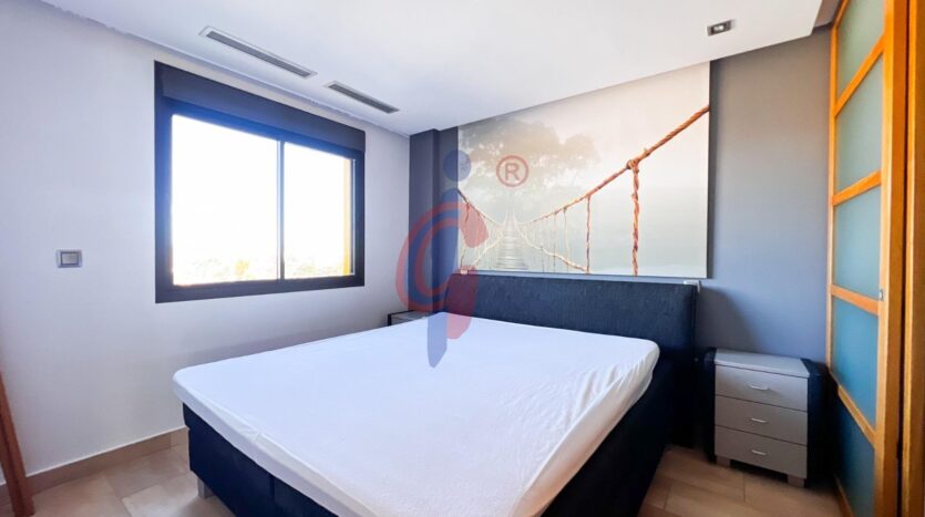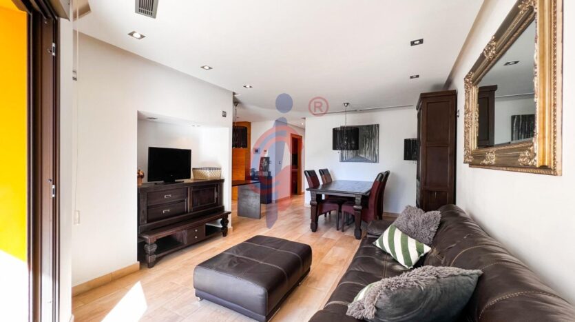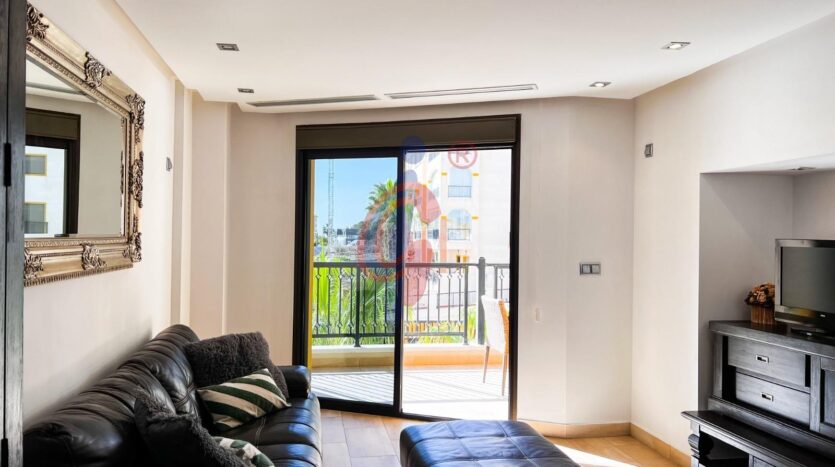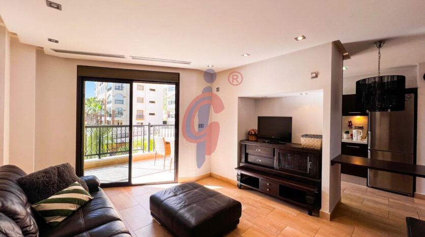Apartamento orientado al sur de 85 m², situado en la segunda planta con acceso por ascensor. Está completamente amueblado con un estilo moderno y materiales de alta calidad, en un estado impecable. Dispone de una amplia terraza cubierta de más de 10 m², ideal para disfrutar del sol durante casi todo el día, con vistas al interior del complejo.
