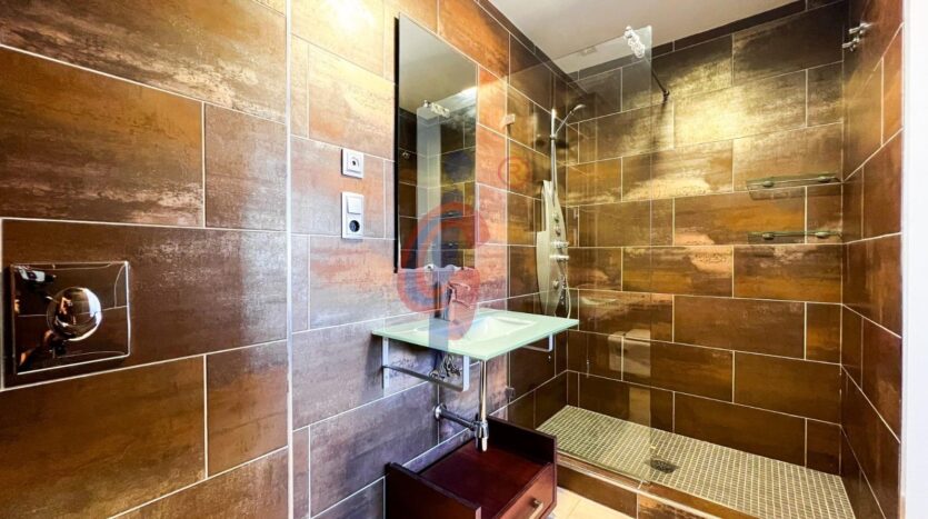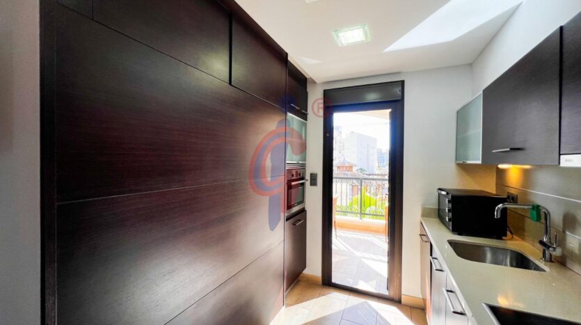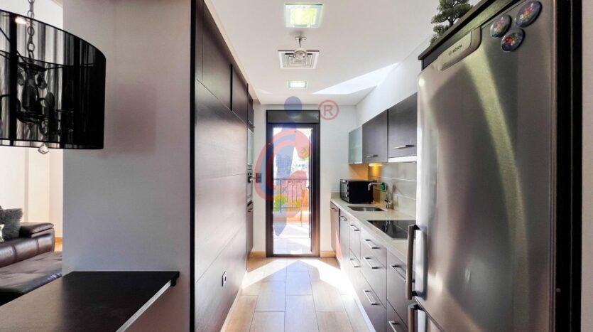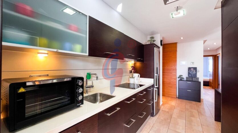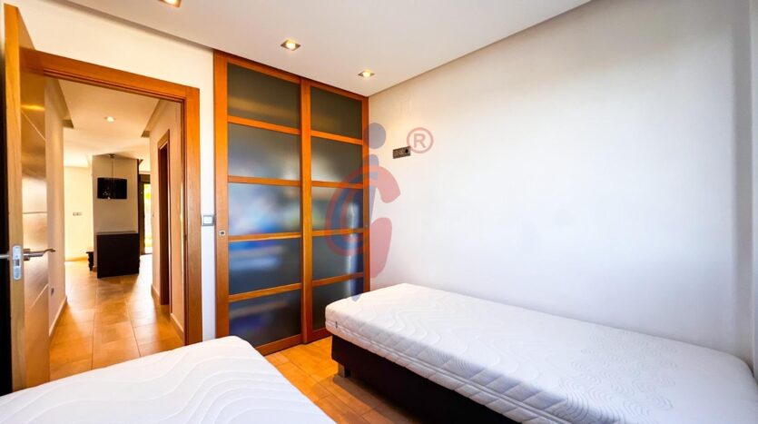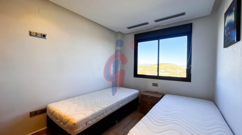 La cocina destaca por su diseño contemporáneo, con abundante espacio de trabajo, mobiliario elegante y electrodomésticos de primeras marcas incluidos. El dormitorio principal dispone de un baño en suite con ducha y amplios armarios empotrados. El segundo dormitorio cuenta con dos camas individuales y armario empotrado. Además, hay un segundo baño completo con ducha.