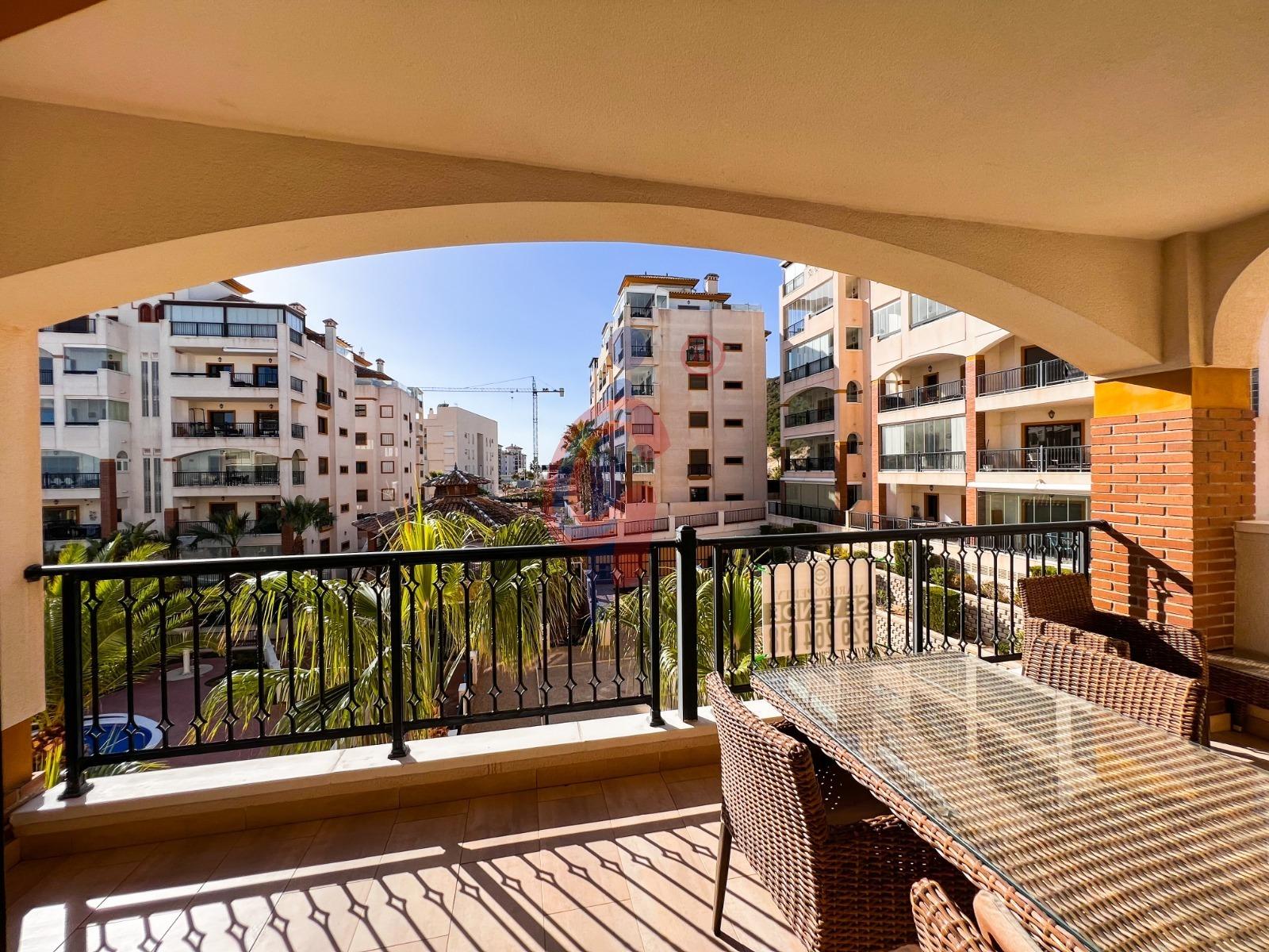 Apartamento orientado al sur de 85 m², situado en la segunda planta con acceso por ascensor. Está completamente amueblado con un estilo moderno y materiales de alta calidad, en un estado impecable. Dispone de una amplia terraza cubierta de más de 10 m², ideal para disfrutar del sol durante casi todo el día, con vistas al interior del complejo.