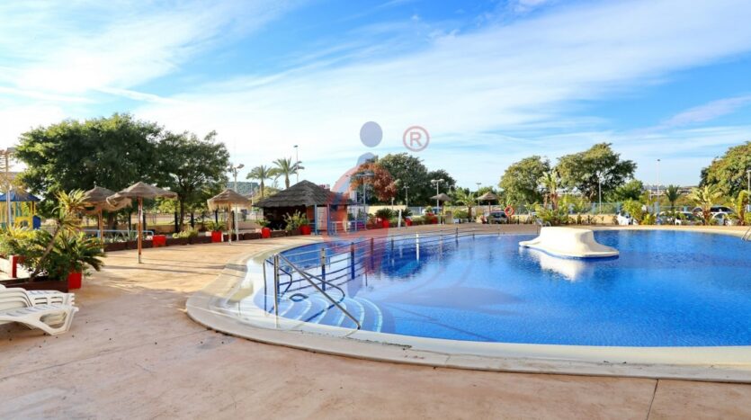 El residencial cuenta con una piscina comunitaria y aparcamiento.