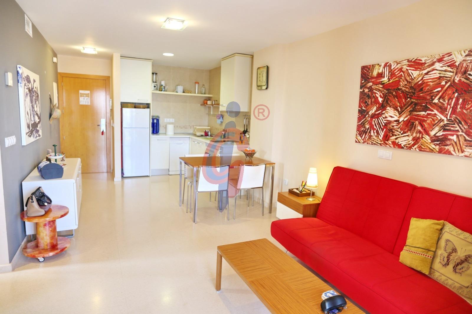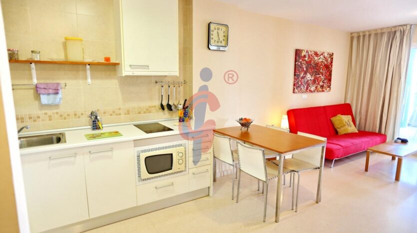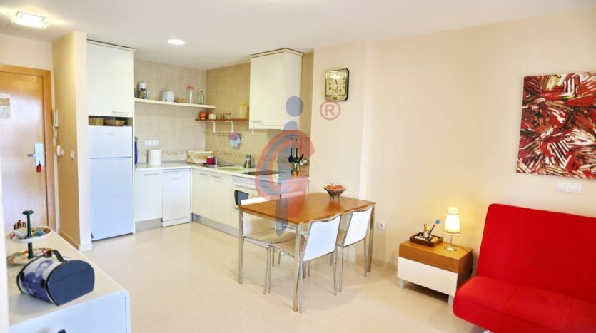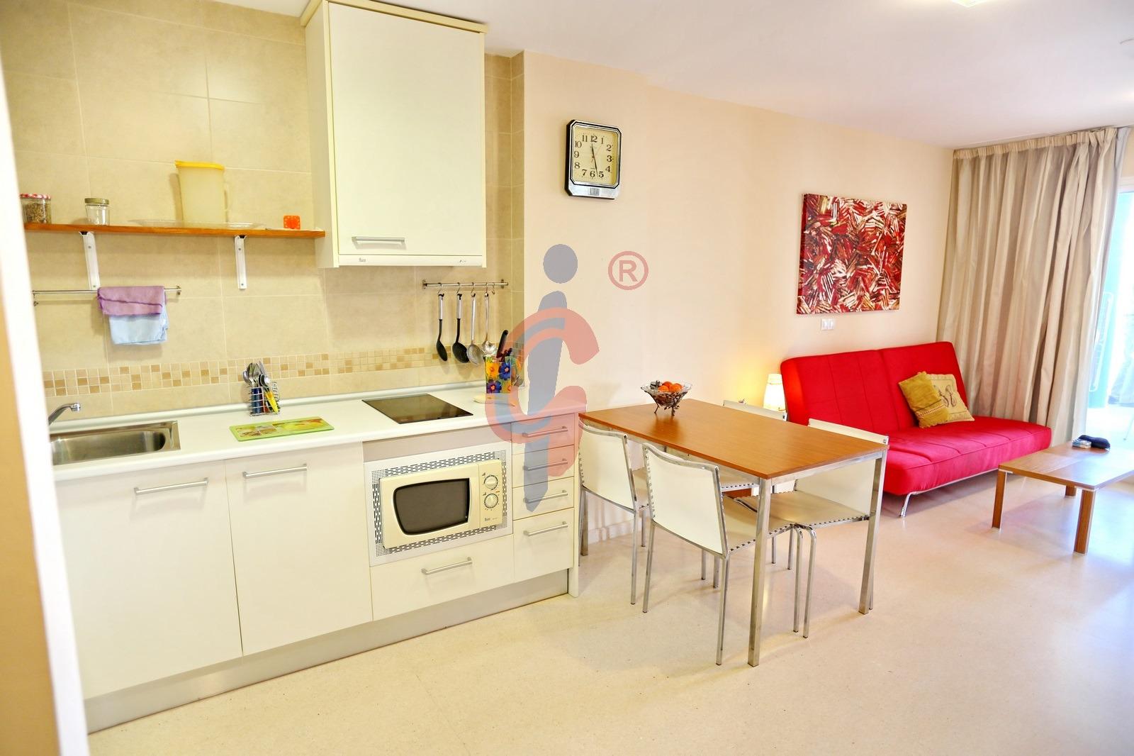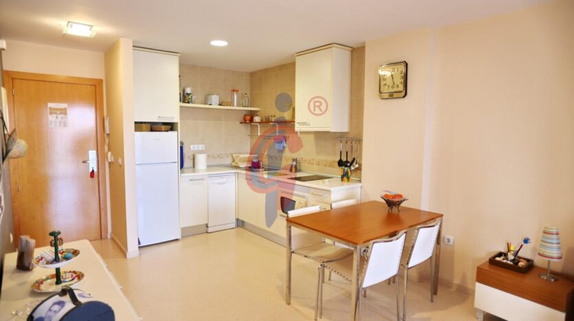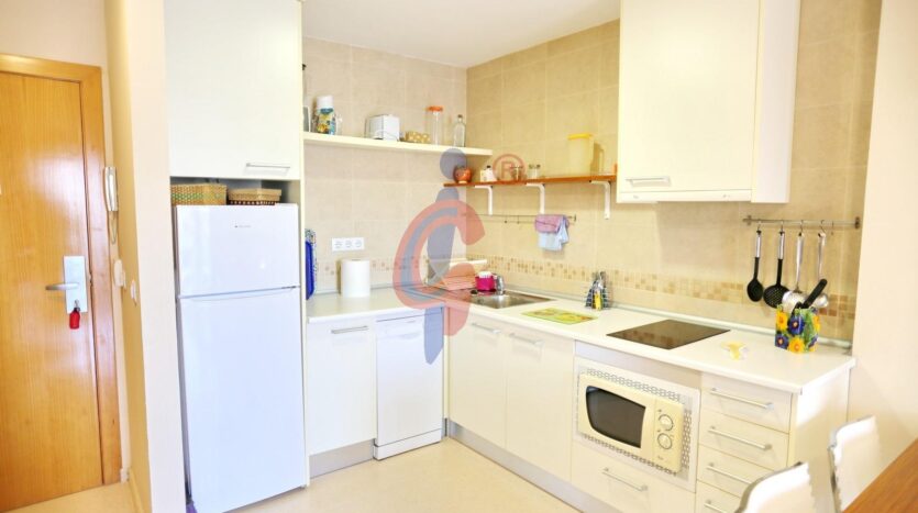 La cocina está unida al salón comedor con muebles en blanco, encimera vitroceramica y electrodomésticos incluidos.