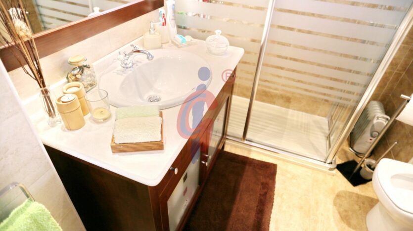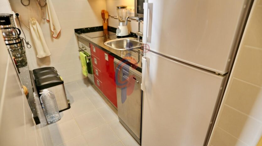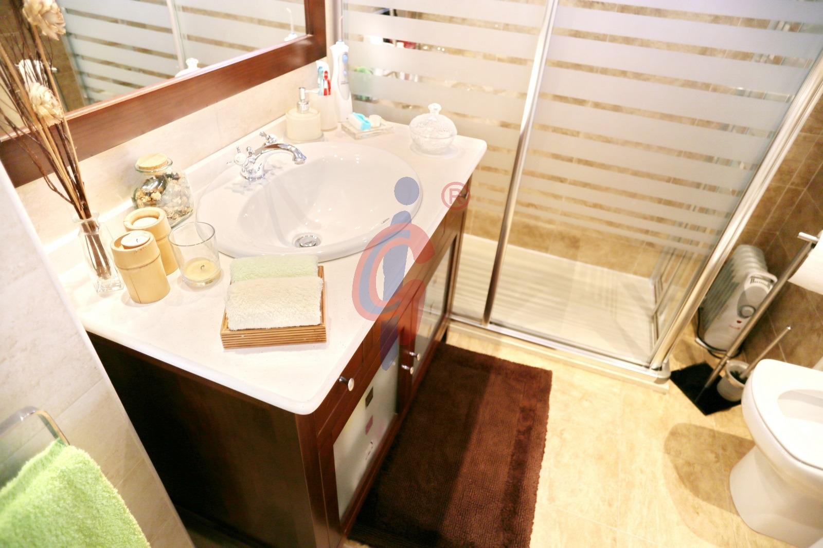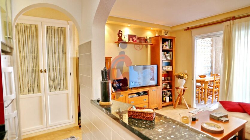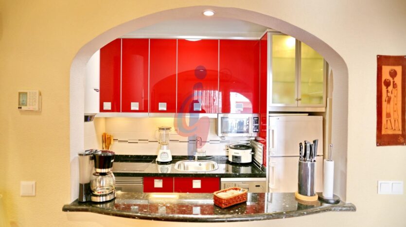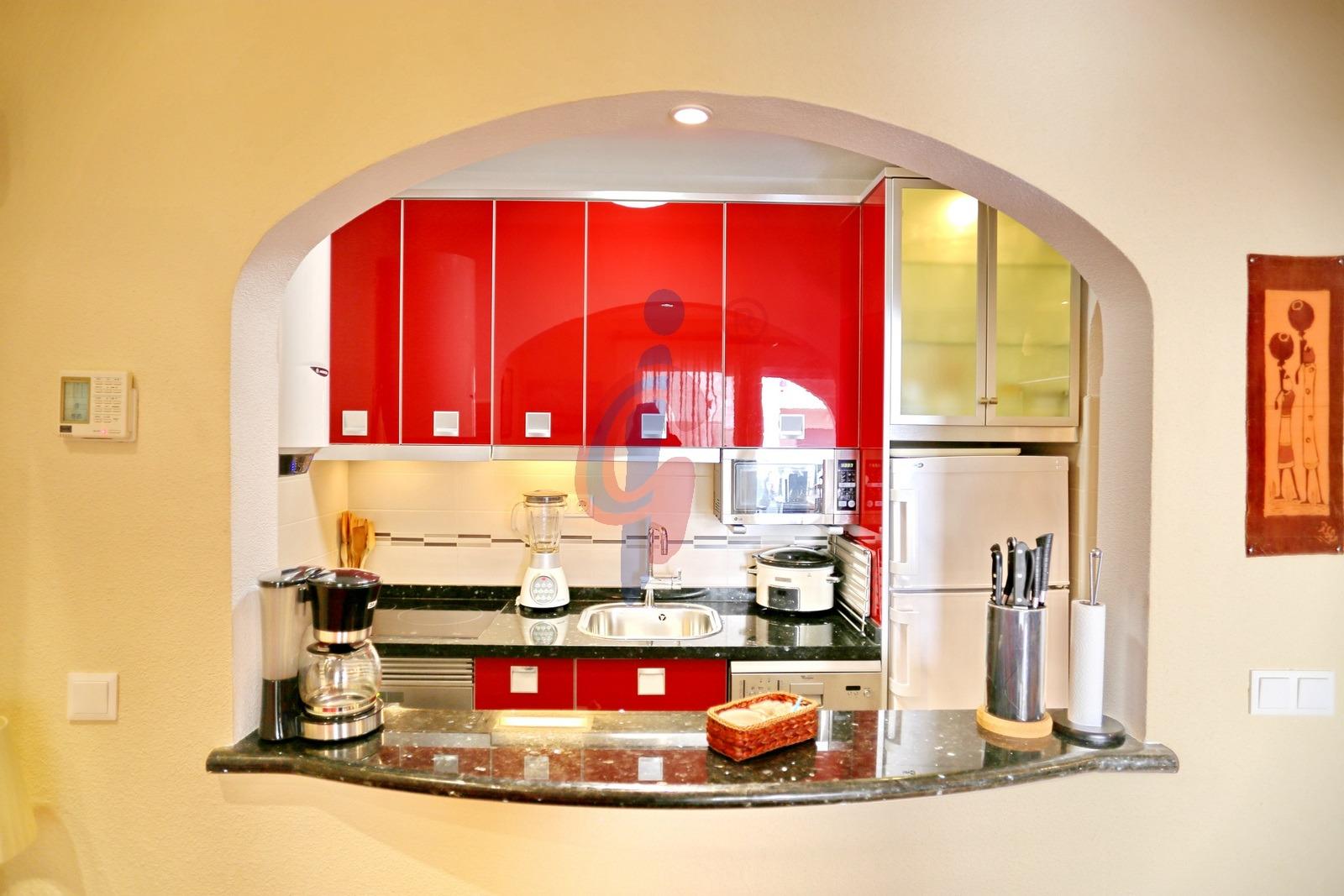 El pasillo conduce al salón-comedor, un espacio amplio y agradablemente decorado. La cocina americana, conectada visualmente con la zona de comedor a través de una ventana, está completamente equipada con encimera de mármol, vitrocerámica, horno eléctrico, frigorífico, lavavajillas, microondas y termo eléctrico Aristón de 50 litros.
