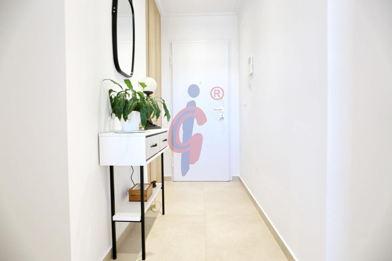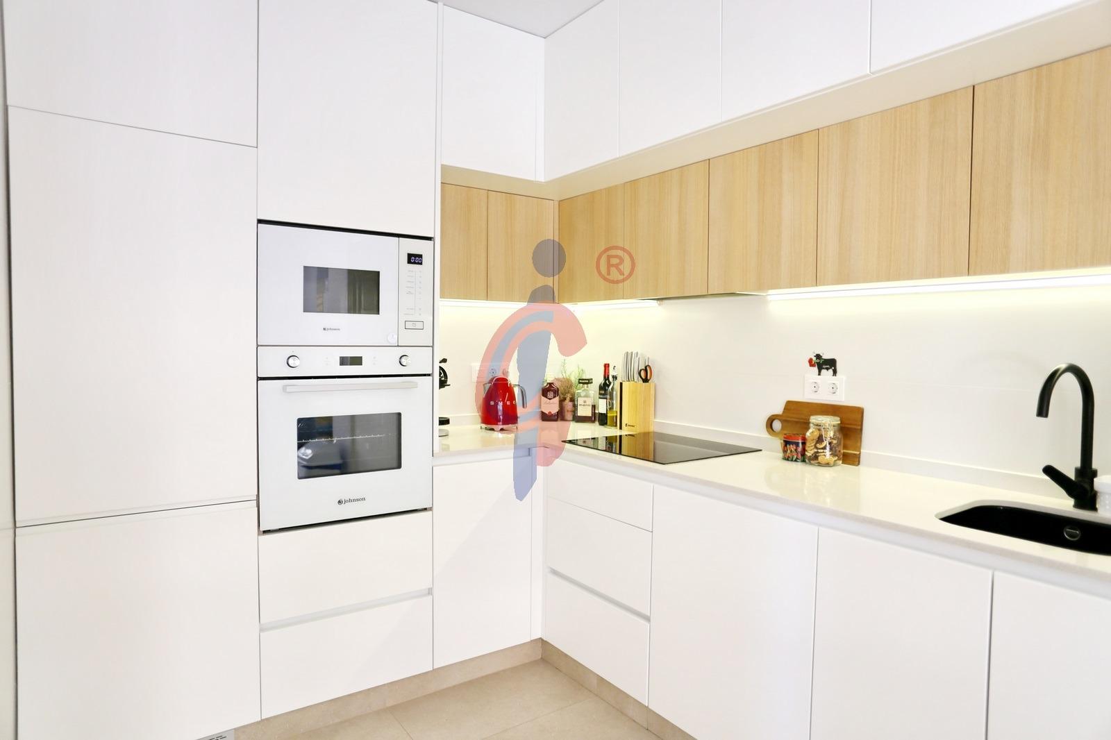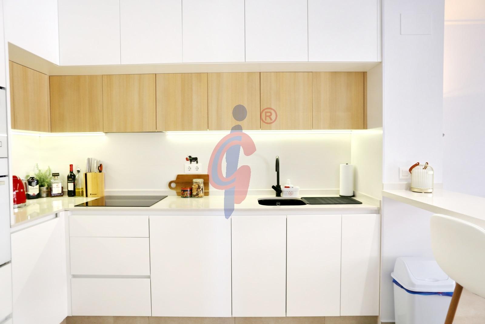 Al acceder a la vivienda, encontramos un recibidor con armario empotrado que da paso a una amplia y luminosa zona de salón-comedor con cocina abierta. La cocina está totalmente equipada y cuenta con barra de desayuno. Una gran puerta corredera conecta el salón con la terraza, creando un espacio amplio y lleno de luz natural.