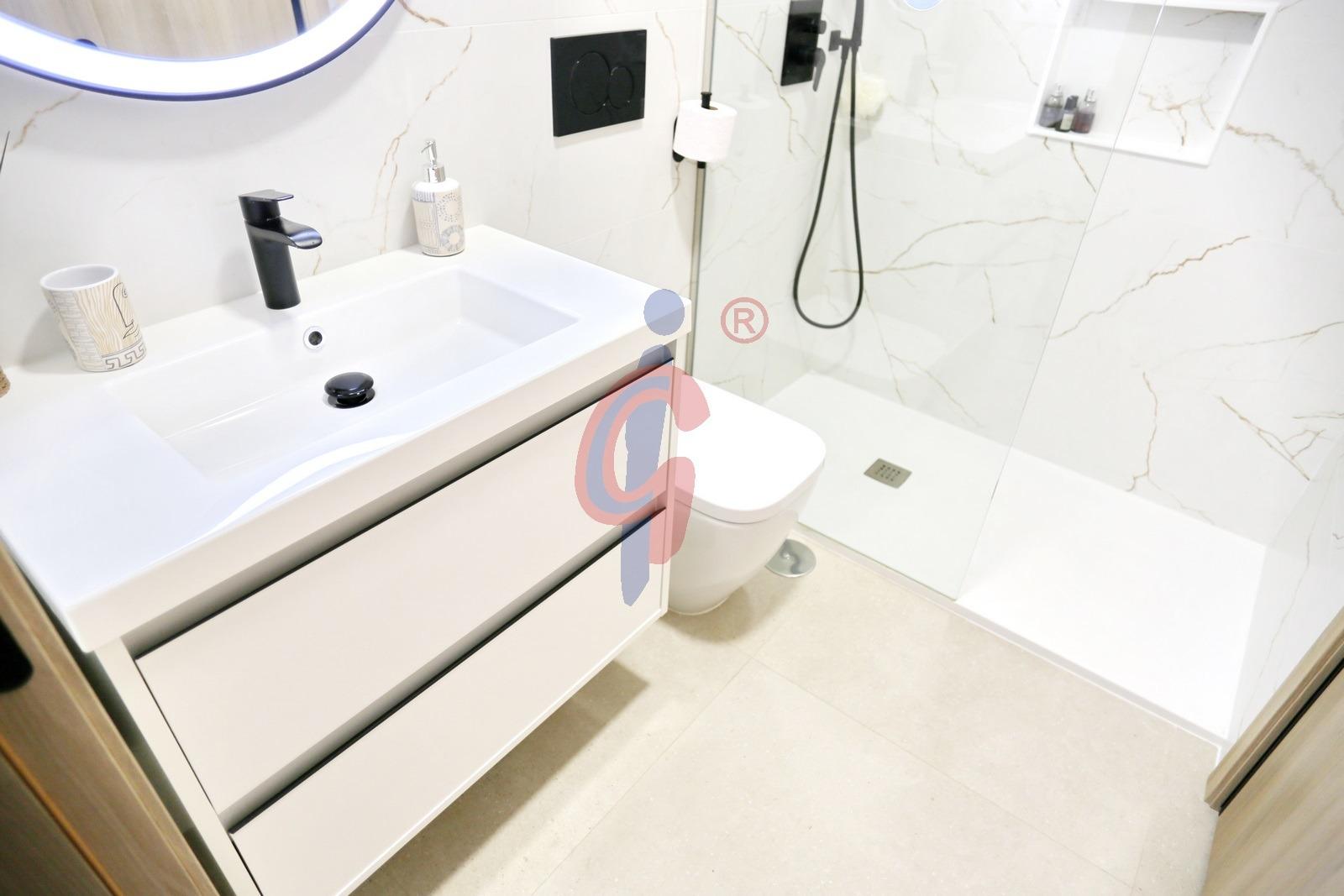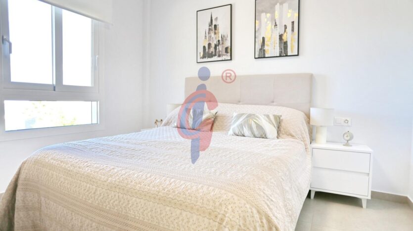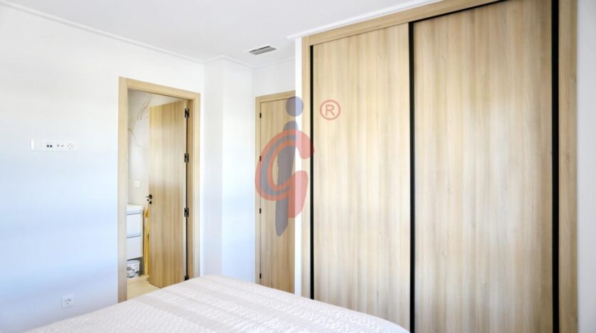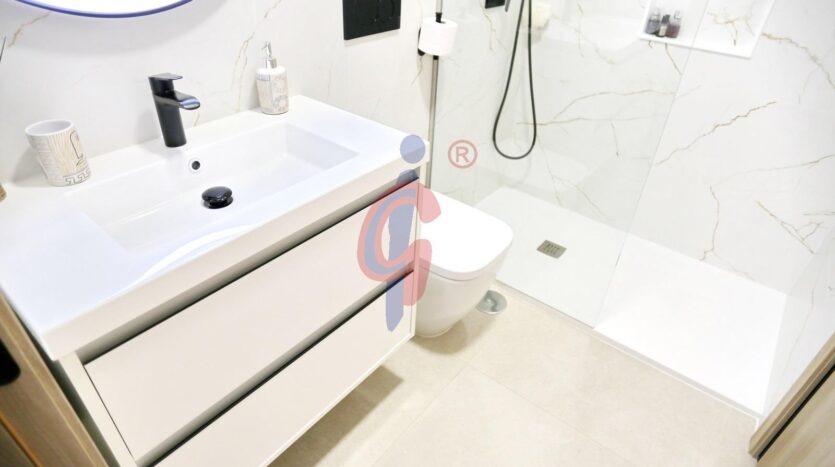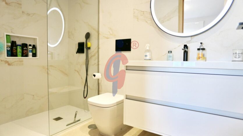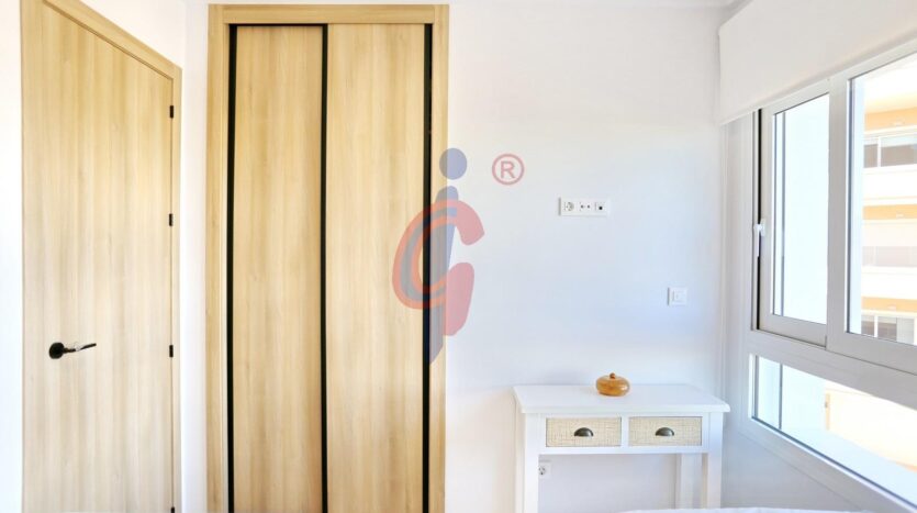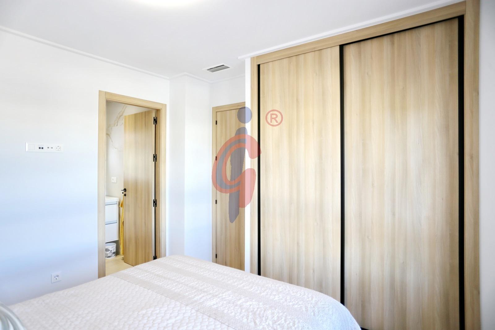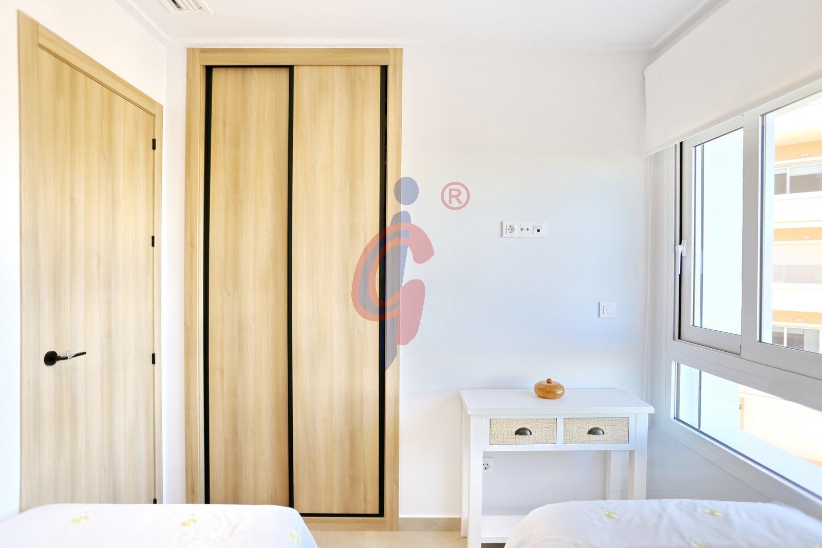 El apartamento dispone de tres dormitorios con armarios empotrados y grandes ventanales orientados al oeste, además de dos baños completos con plato de ducha, uno de ellos en suite y el segundo con armario empotrado para almacenamiento adicional.