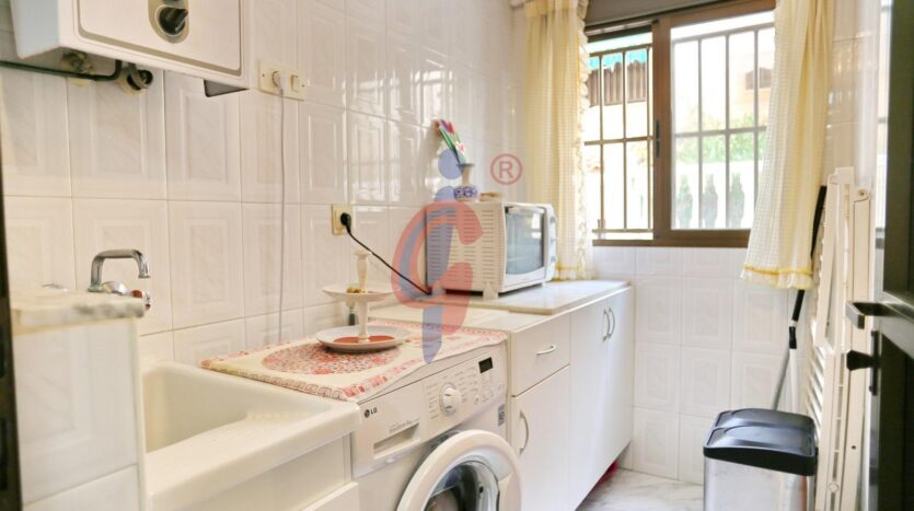 La planta baja cuenta con un amplio salón comedor, decorado con un estilo chic. Está conectado a la cocina independiente, completamente equipada y bastante amplia también con una zona para desayunar. Anexada a la cocina hay una galería con espacio de almacenaje y para lavadora. Esta galería tiene una amplia ventana que permite una iluminación natural hacia la cocina, también tiene un aseo completo con ducha.