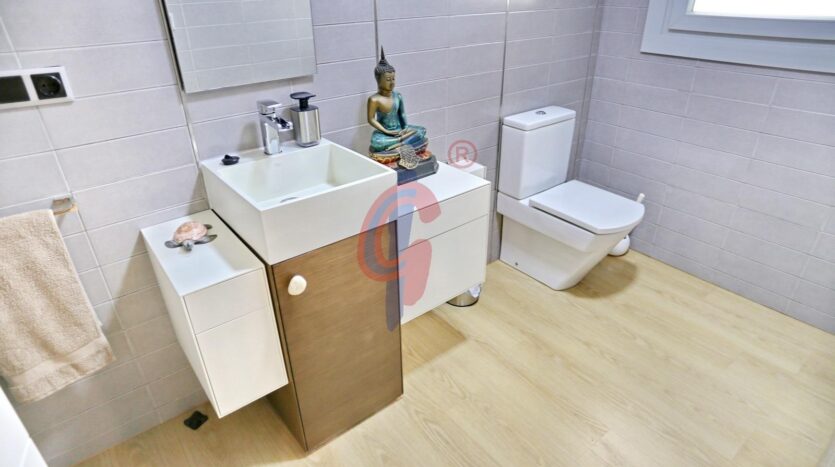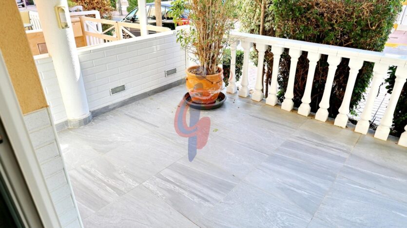 La vivienda destaca por su gran luminosidad, su cuidada decoración y sus excelentes calidades, como los suelos de parquet y los amplios espacios. En la planta principal se encuentra un recibidor espacioso que da paso a un amplio salón-comedor con capacidad para más de ocho personas, integrado con una cocina moderna y totalmente equipada con electrodomésticos de alta gama. En esta misma planta hay un baño completo y dos terrazas, una de ellas acristalada con acceso directo a las zonas comunes, que incluyen piscina y jardines perfectamente cuidados.