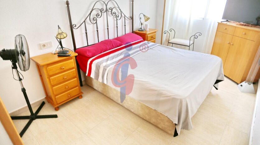 – Amplio dormitorio con una cama de matrimonio y un armario empotrado, mesitas de noche y aire acondicionado split en pared.