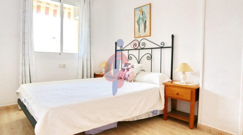 – Primer dormitorio con cama doble y ventana a la terraza, ofreciendo un ambiente tranquilo y cómodo.