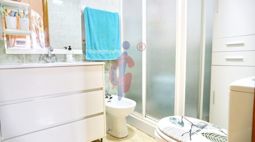 – Baño completo con lavabo, bidé, inodoro, plato de ducha y mueble de almacenamiento.