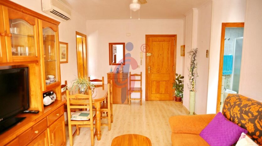 – Amplio y luminoso salón-comedor, parcialmente amueblado, con aire acondicionado y acceso directo a una terraza privada, ideal para disfrutar del sol de tarde. Desde la terraza se puede disfrutar de vistas a la piscina comunitaria.