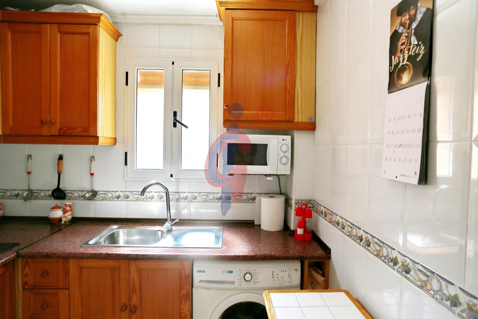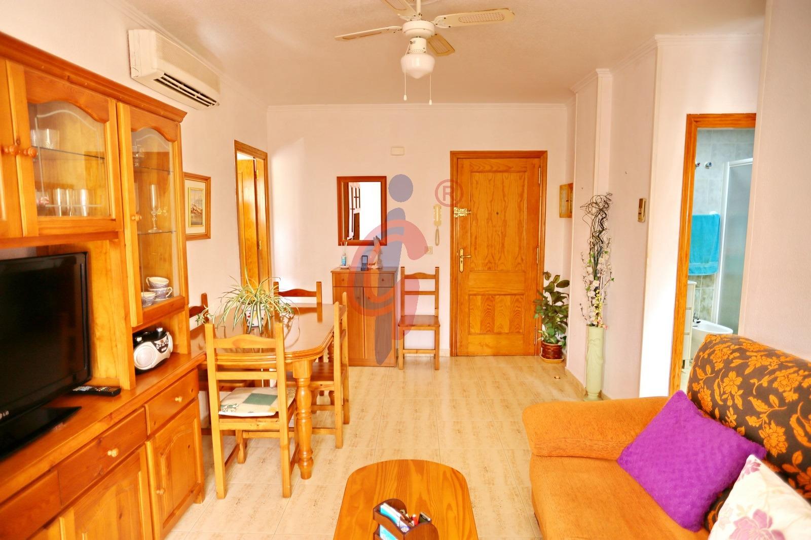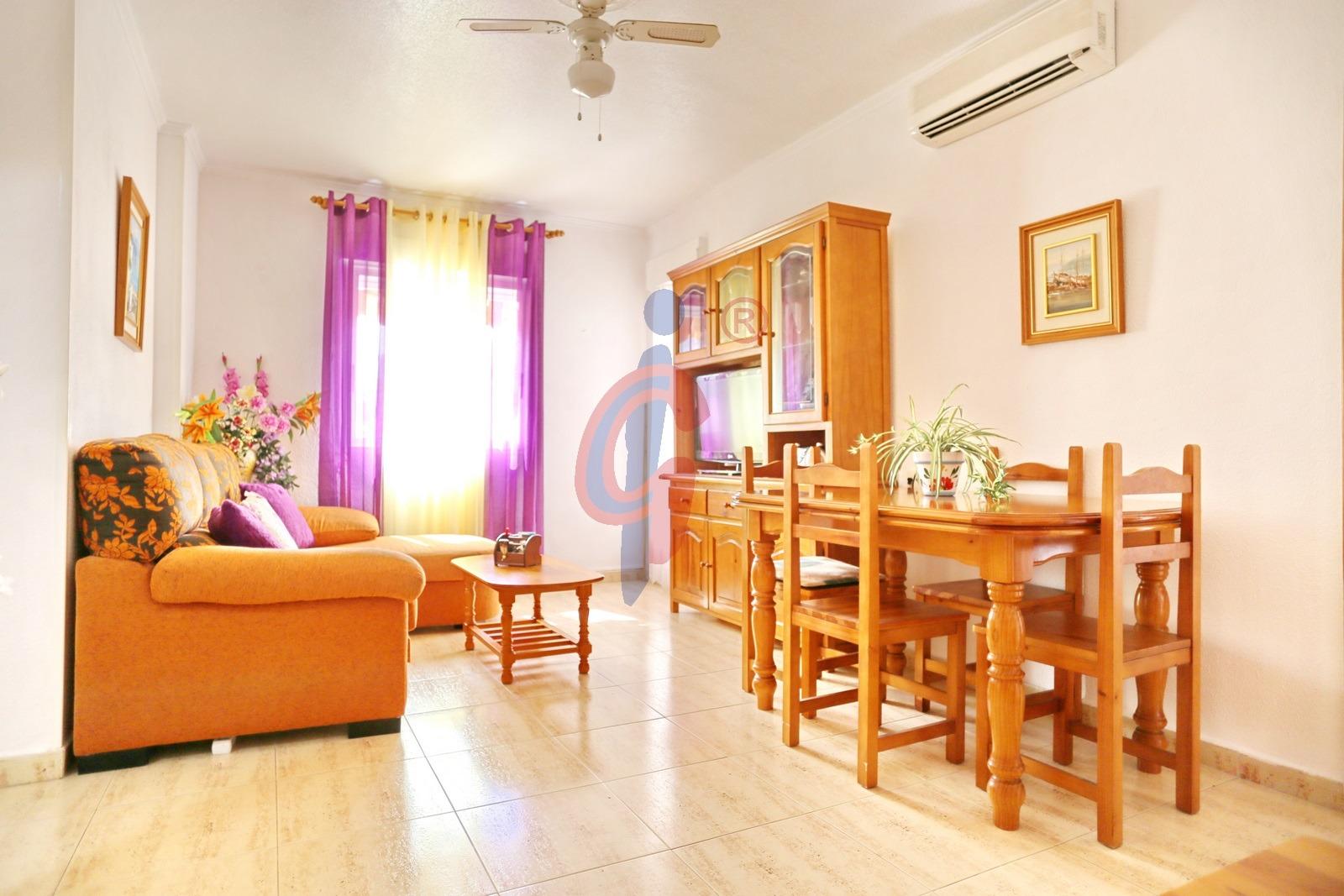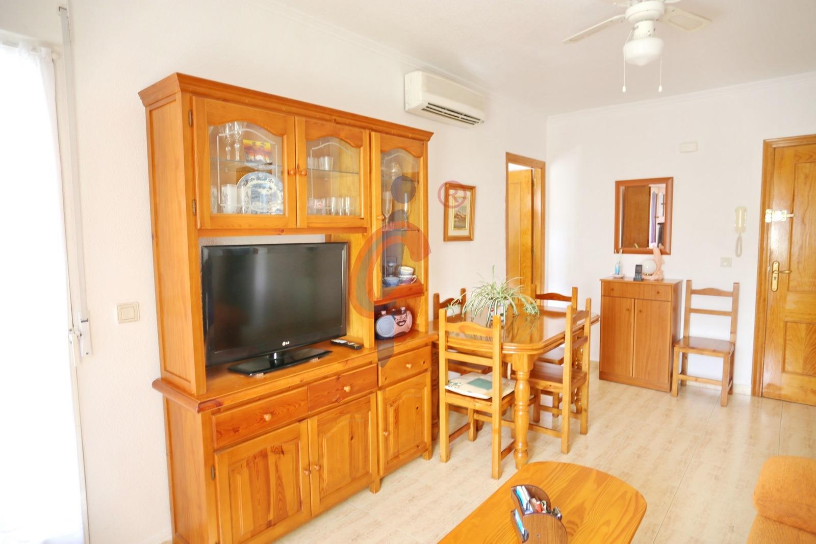 – Amplio y luminoso salón-comedor, parcialmente amueblado, con aire acondicionado y acceso directo a una terraza privada, ideal para disfrutar del sol de tarde. Desde la terraza se puede disfrutar de vistas a la piscina comunitaria.