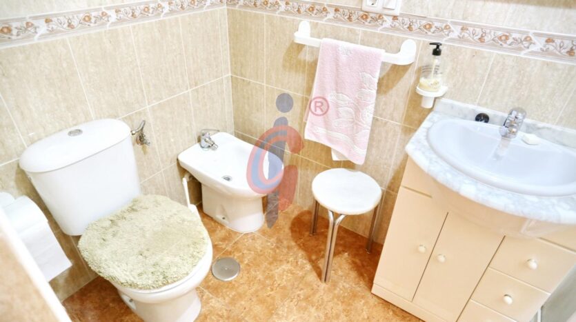 * Baño completo con ducha, lavabo, inodoro, bidé y mueble auxiliar para almacenaje.