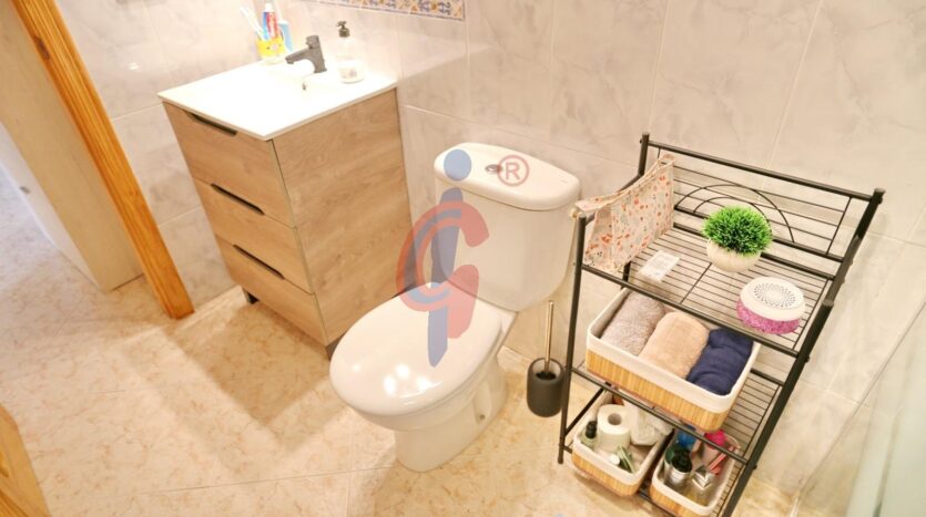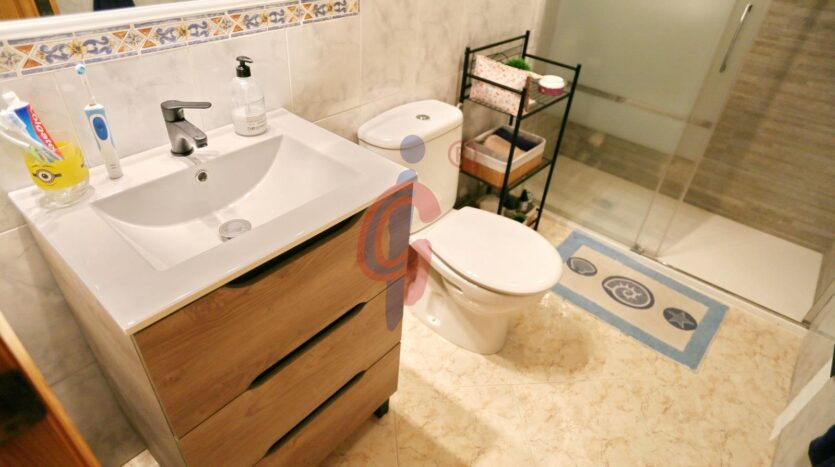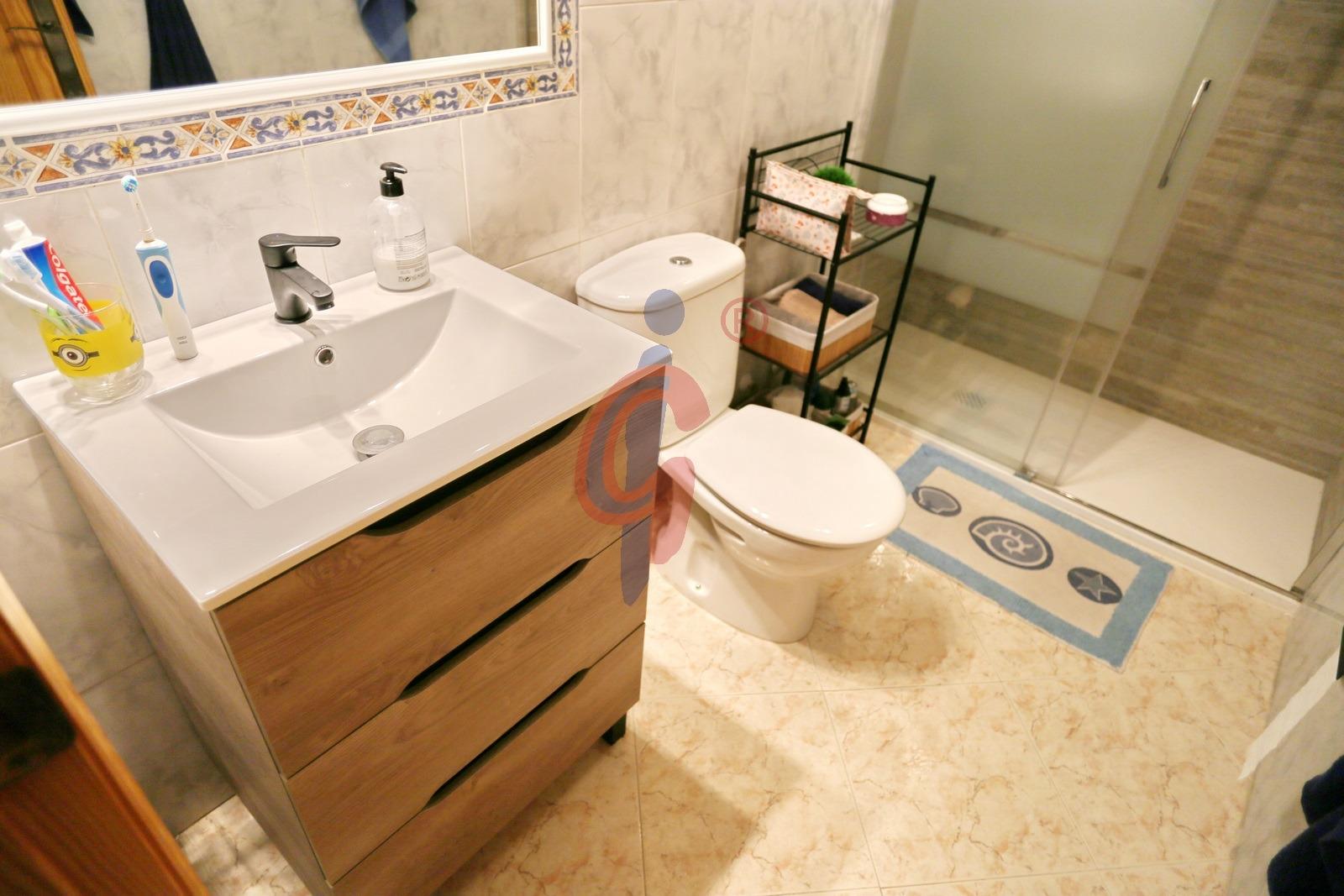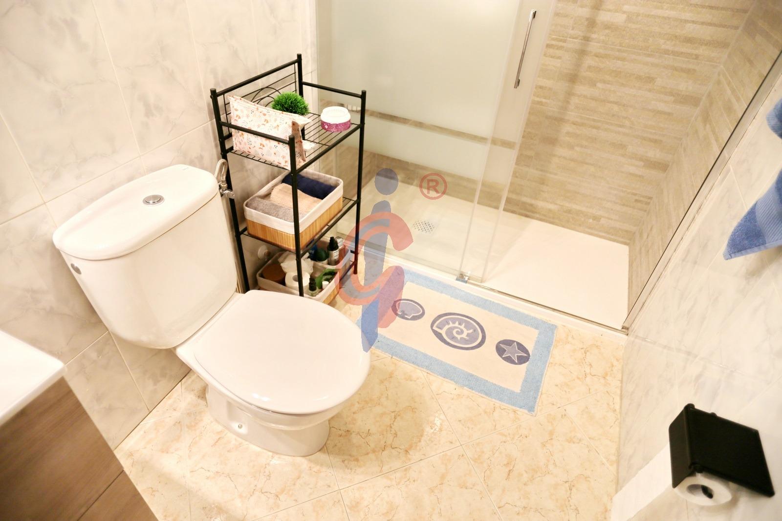 El cuarto de baño es completo, está reformado, y cuenta con ducha, inodoro y lavabo, todo en perfecto estado y con acabados de calidad.