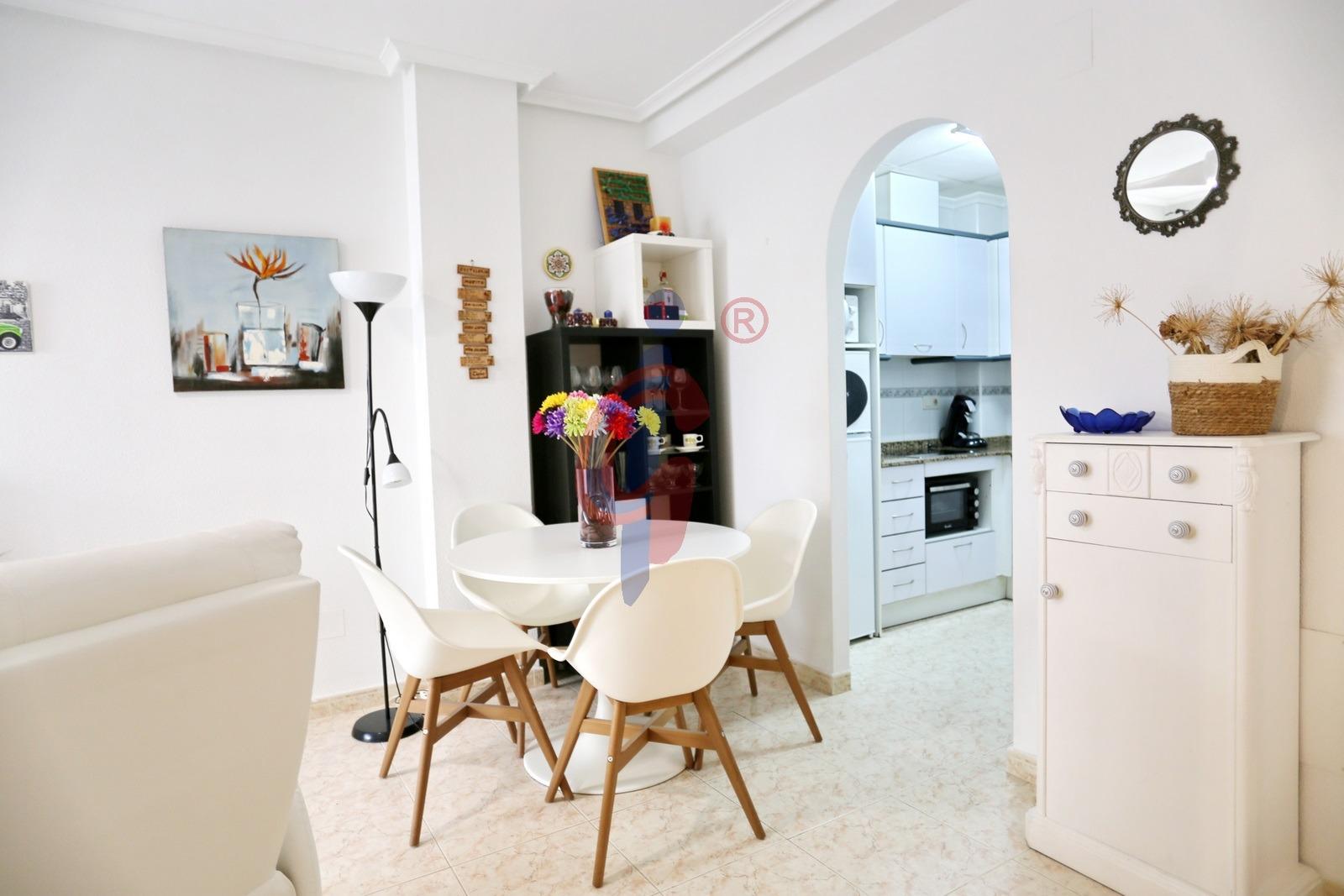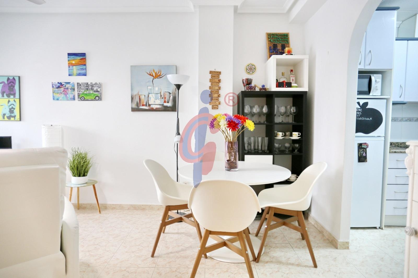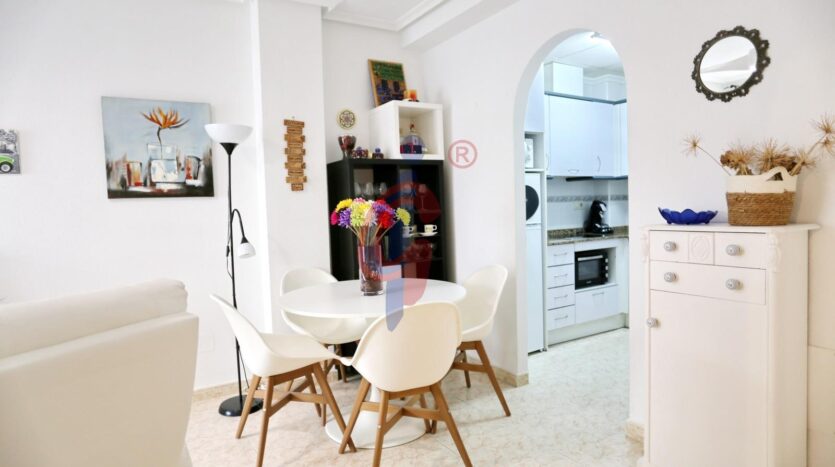 Al entrar, nos encontramos con un elegante salón-comedor, decorado con buen gusto, que ofrece una atmósfera relajada y acogedora. Desde esta estancia se accede a una tranquila terraza interior, perfecta para disfrutar de un desayuno al aire libre, leer o simplemente relajarse. La cocina es semi-independiente, y está equipada con todos los electrodomésticos esenciales, lista para entrar a vivir sin necesidad de reformas ni equipamiento adicional.