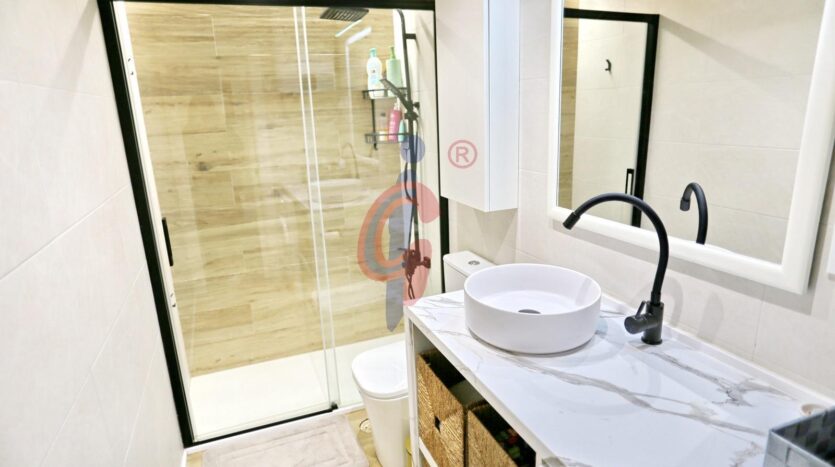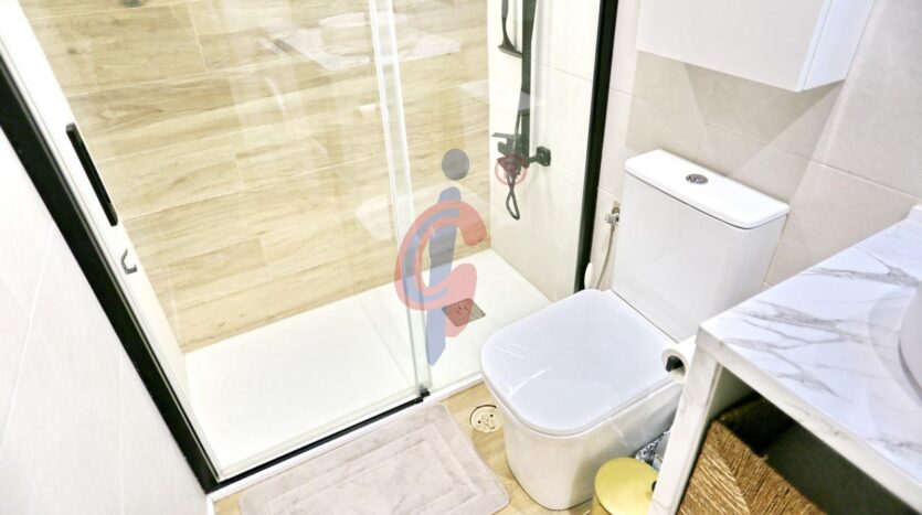 – Baño completo con plato de ducha, lavabo con muebles de baño y un inodoro.