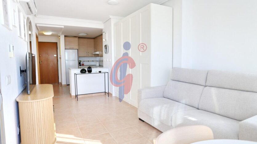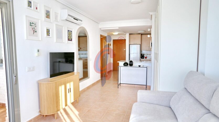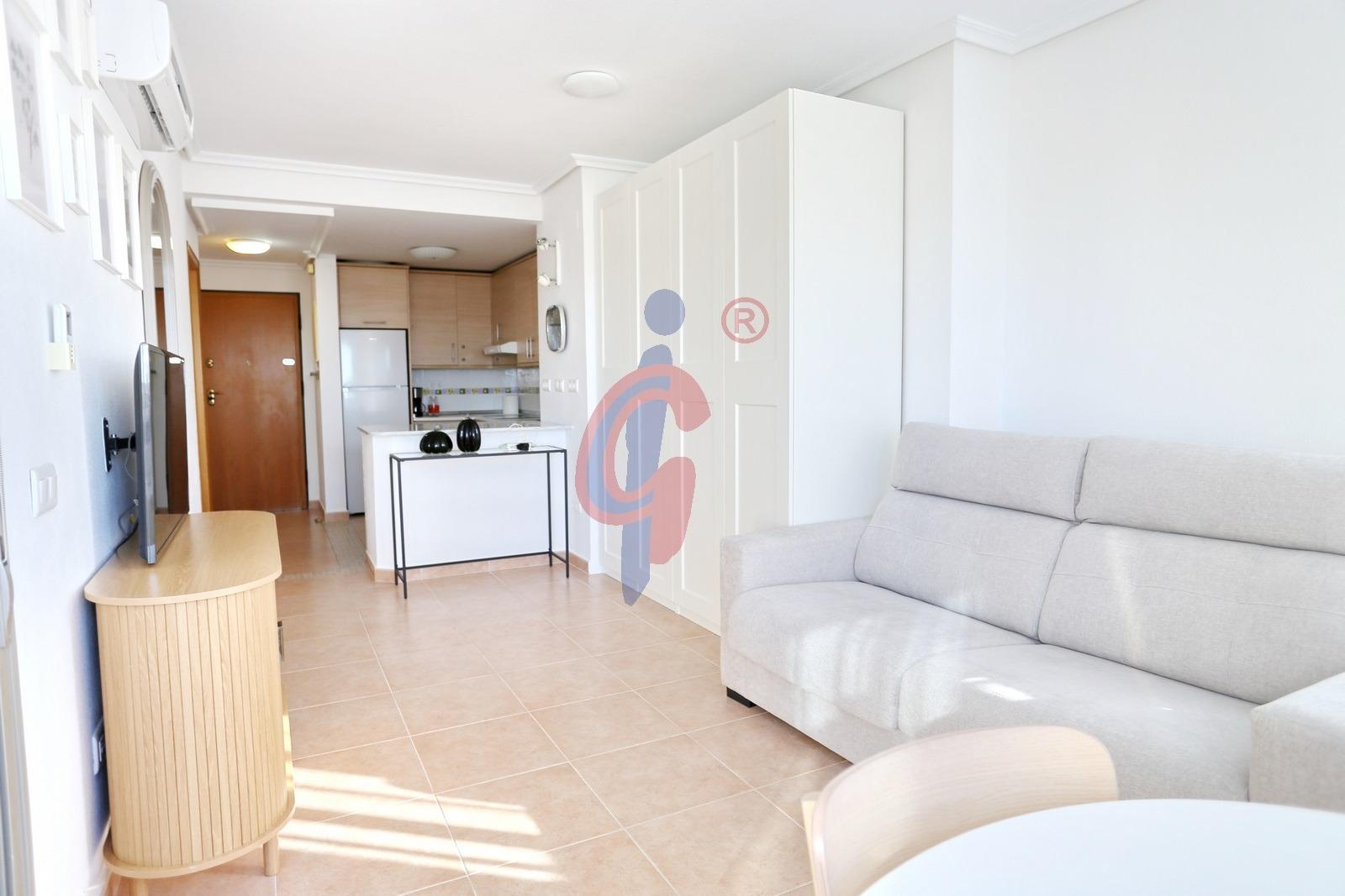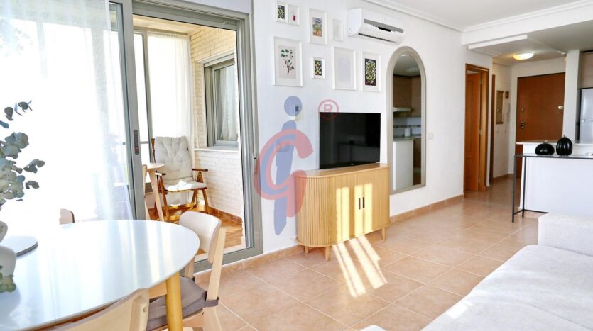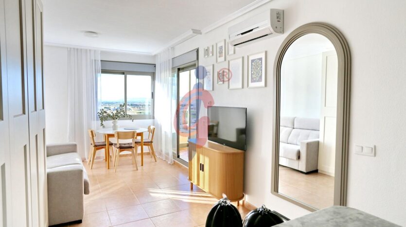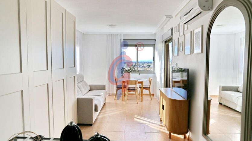El apartamento cuenta con un dormitorio independiente, tranquilo y bien aislado, un baño completo con bañera y un espacio abierto que integra el salón y la cocina, creando un ambiente acogedor y práctico. Parte de la terraza se ha acristalado con ventanales de suelo a techo, ofreciendo un espacio versátil con orientación noroeste. La vivienda se entrega amueblada y dispone de aire acondicionado tipo split, lista para entrar a vivir.