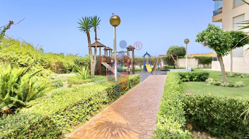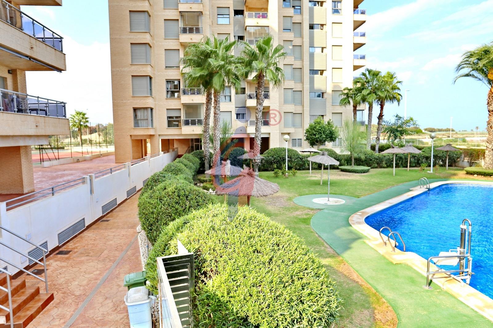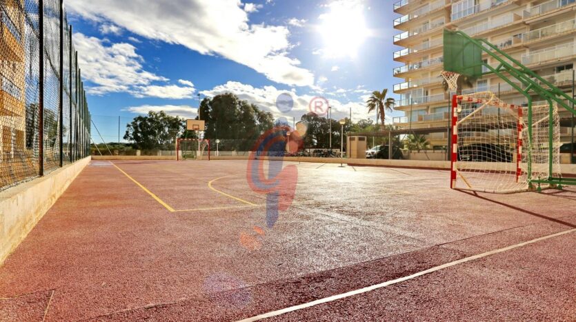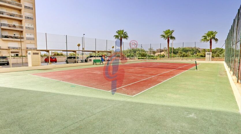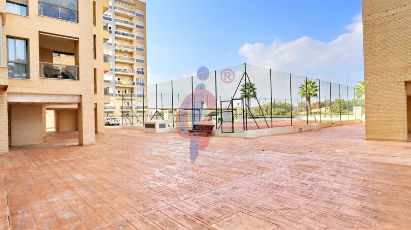 El residencial destaca por su amplitud y cuidado, ofreciendo un entorno tranquilo que recuerda a un resort privado. Entre sus instalaciones se incluyen una piscina panorámica de gran tamaño, pista de tenis, zonas deportivas como voleibol y fútbol, mini golf y amplios jardines perfectamente mantenidos. La arquitectura moderna y los espacios abiertos aportan sensación de libertad y confort. Aunque no dispone de plaza de garaje privada, aparcar en la zona es sencillo, y existe la opción de alquilar una plaza subterránea en el mismo edificio.
