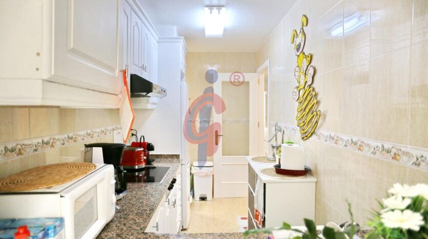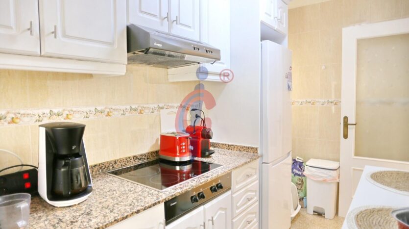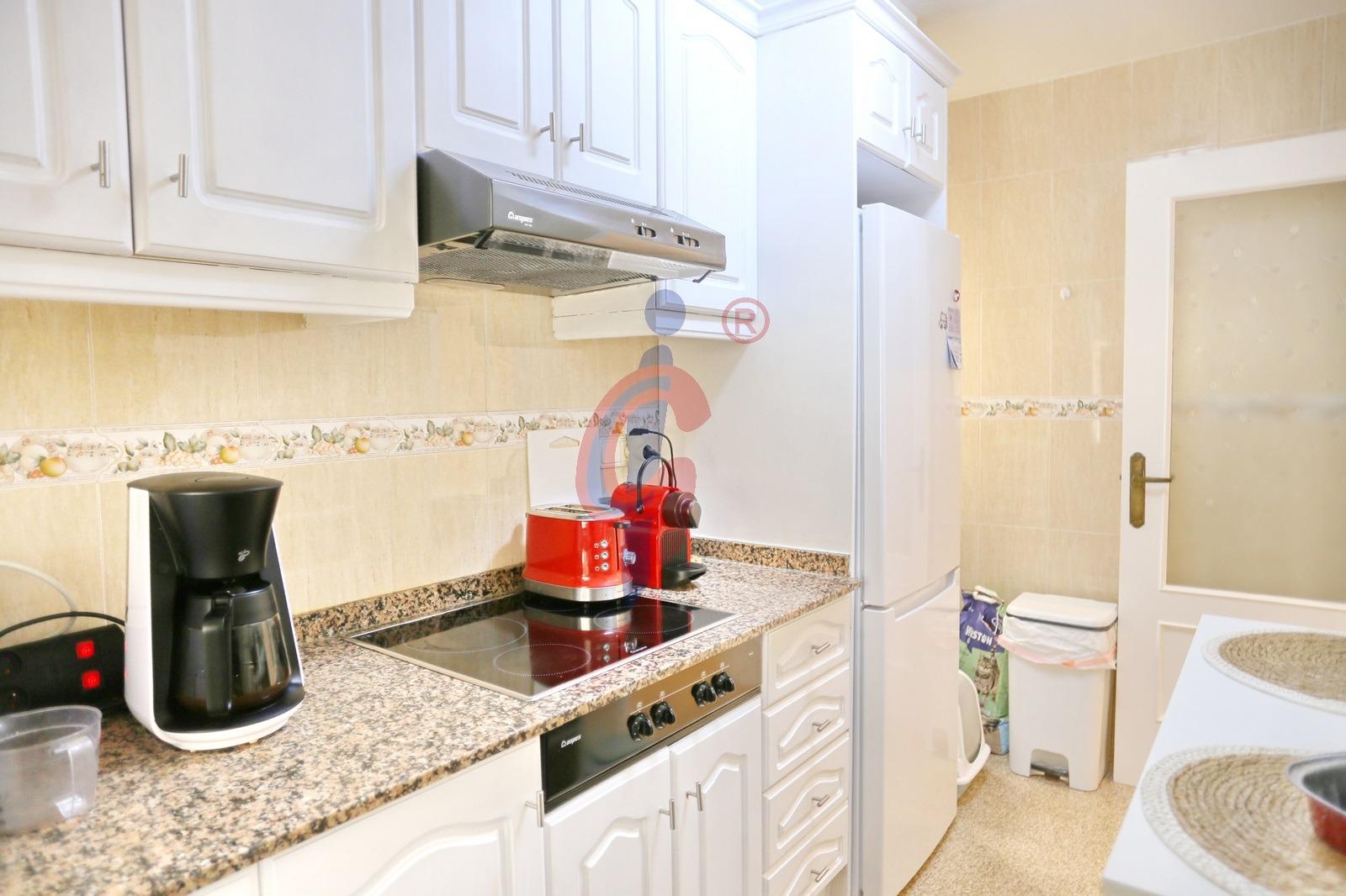 La cocina, semiindependiente y equipada, se integra de manera funcional con el salón gracias a su pasaplatos, facilitando el día a día y creando una conexión fluida entre los espacios.