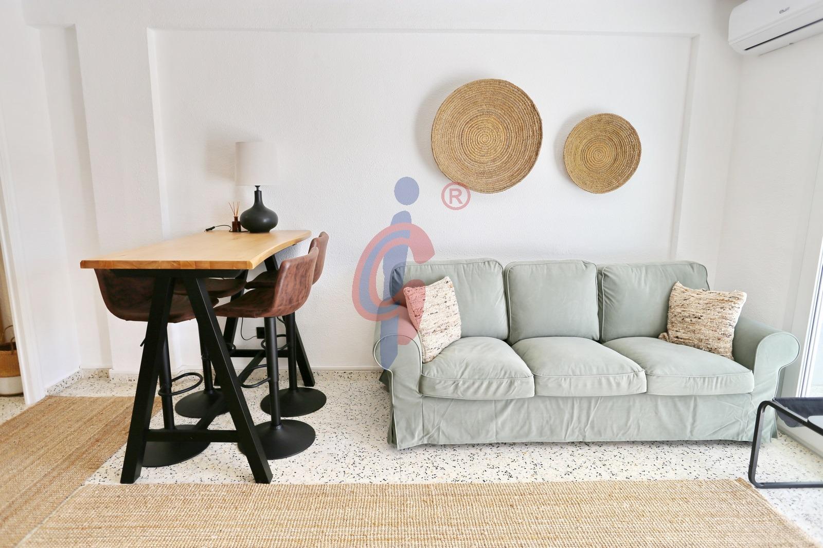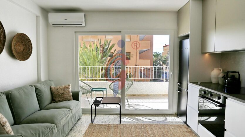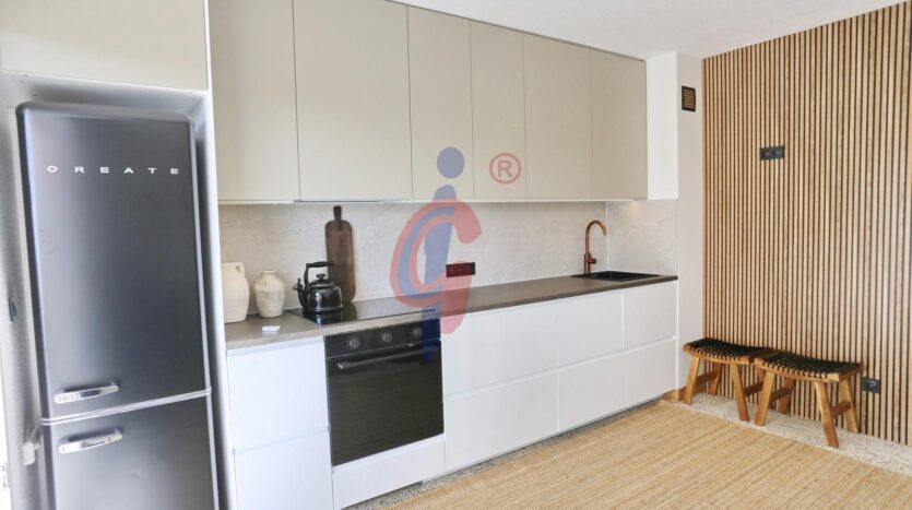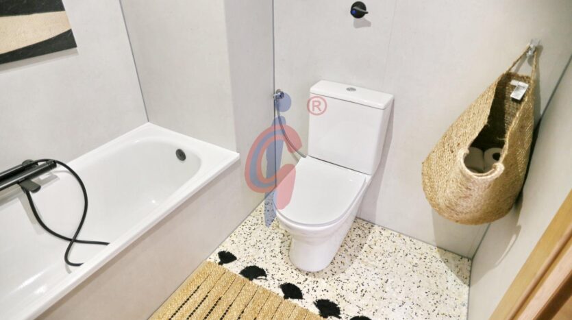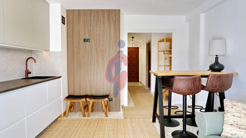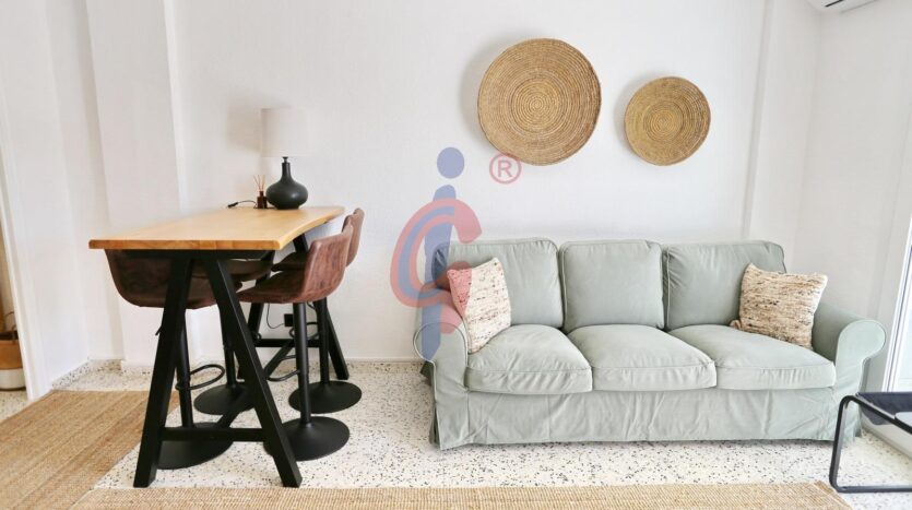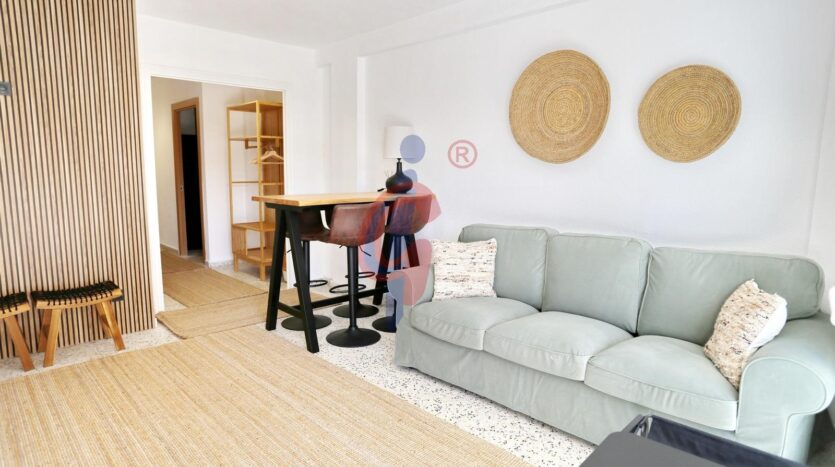 La vivienda se encuentra en una segunda planta, dentro de un edificio que cuenta con dos ascensores, y ha sido reformada recientemente, presentándose completamente a estrenar. Los suelos de terrazo blanco pulido aportan luminosidad y elegancia, mientras que el salón-comedor se integra con la cocina, completamente equipada e incluyendo lavavajillas, creando un espacio moderno y funcional. La terraza, de orientación sur, se accede directamente desde el salón-comedor y garantiza luz natural durante todo el día. En ella se encuentra el calentador de agua y existe la posibilidad de instalar un toldo.