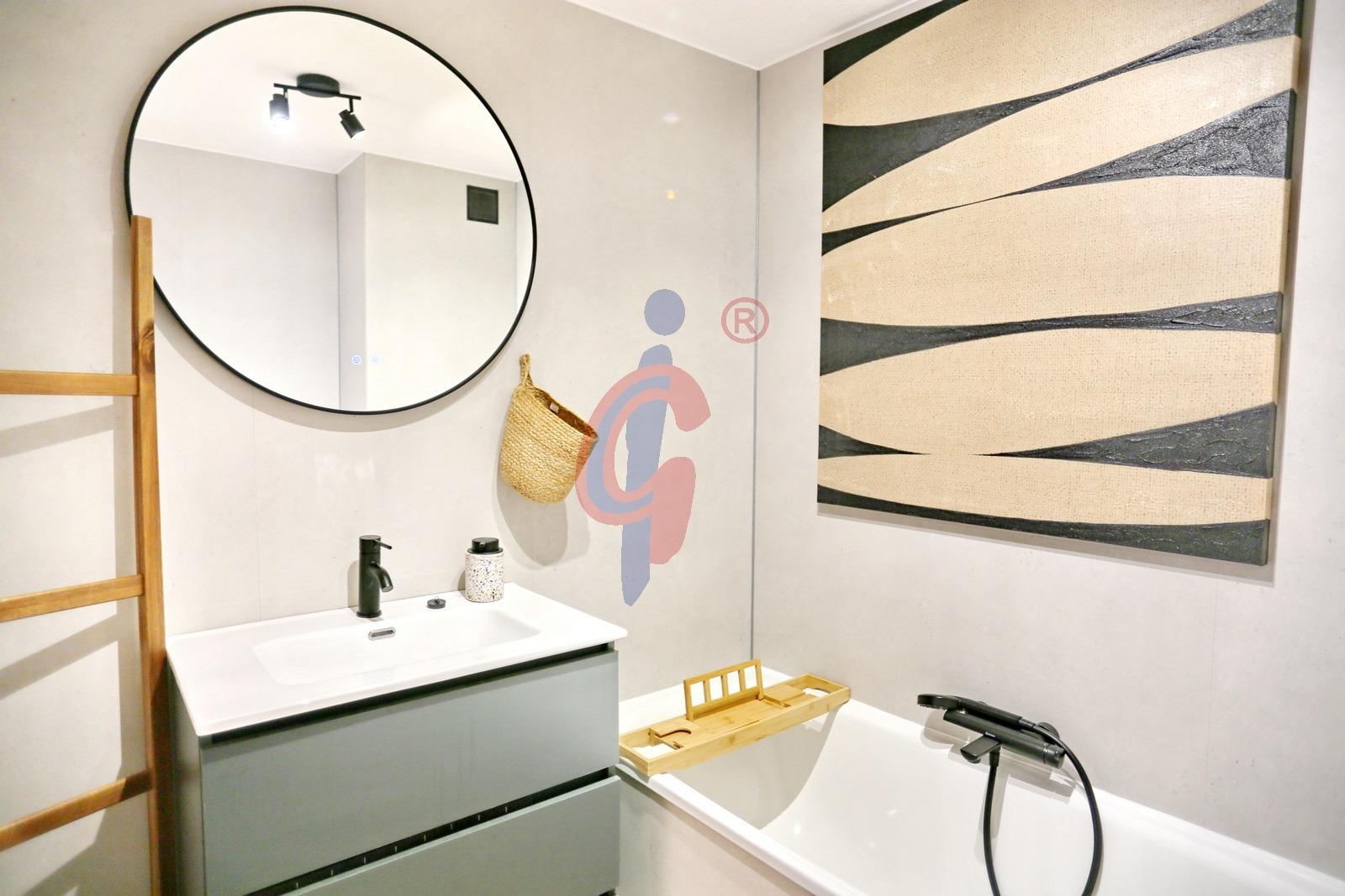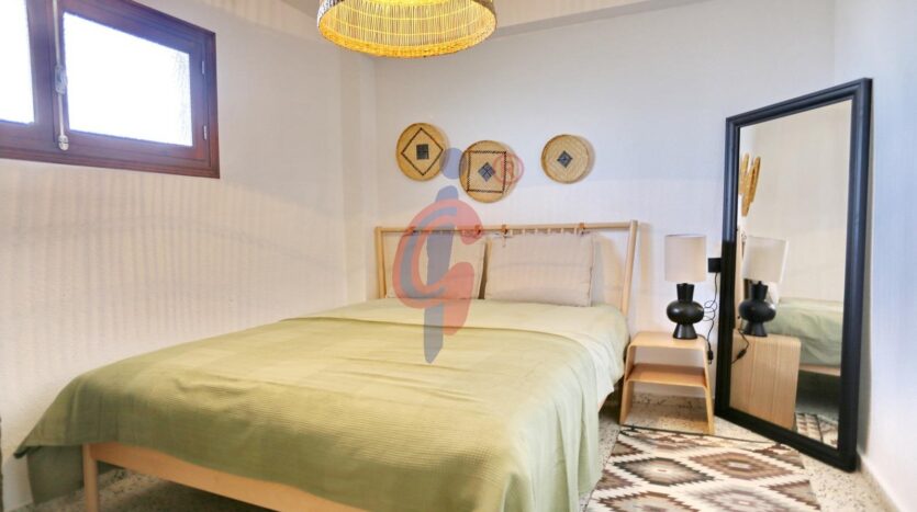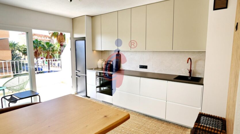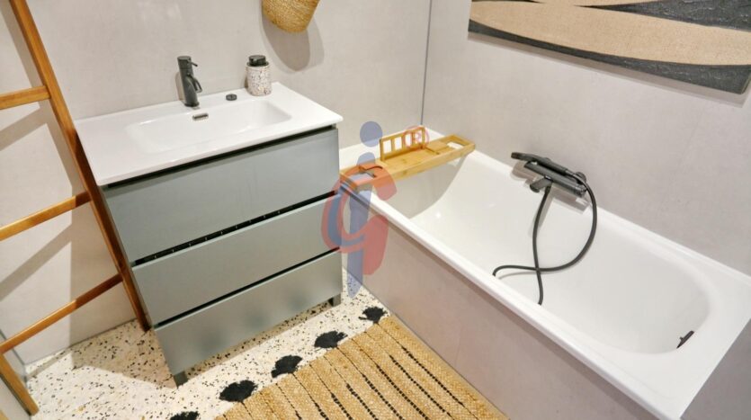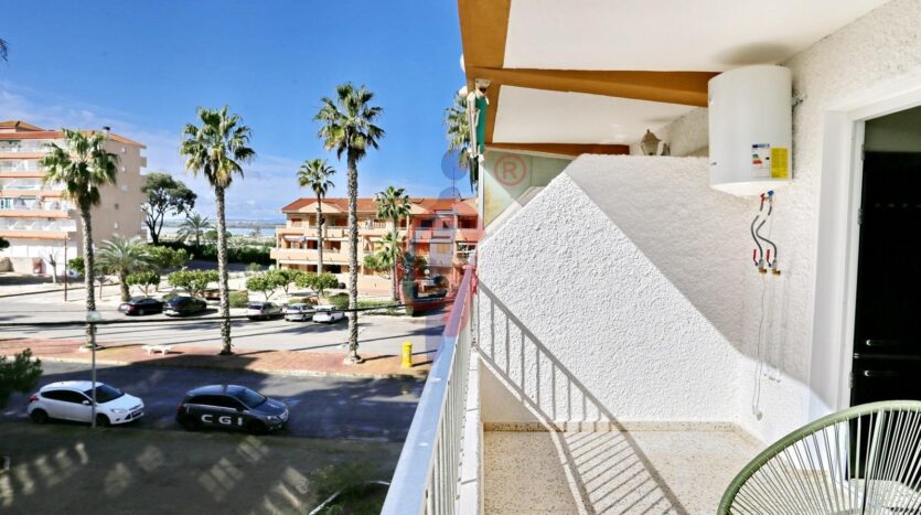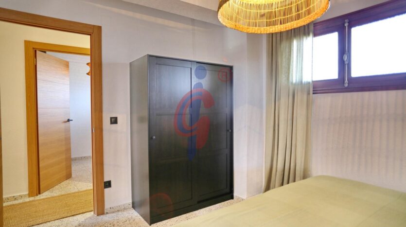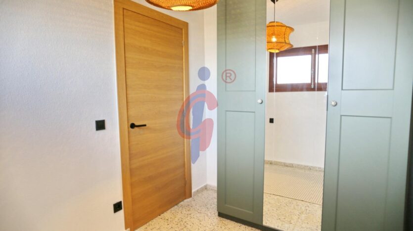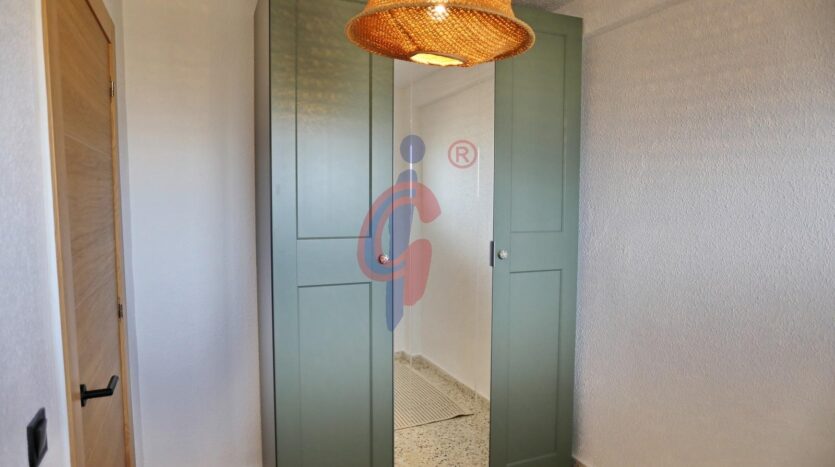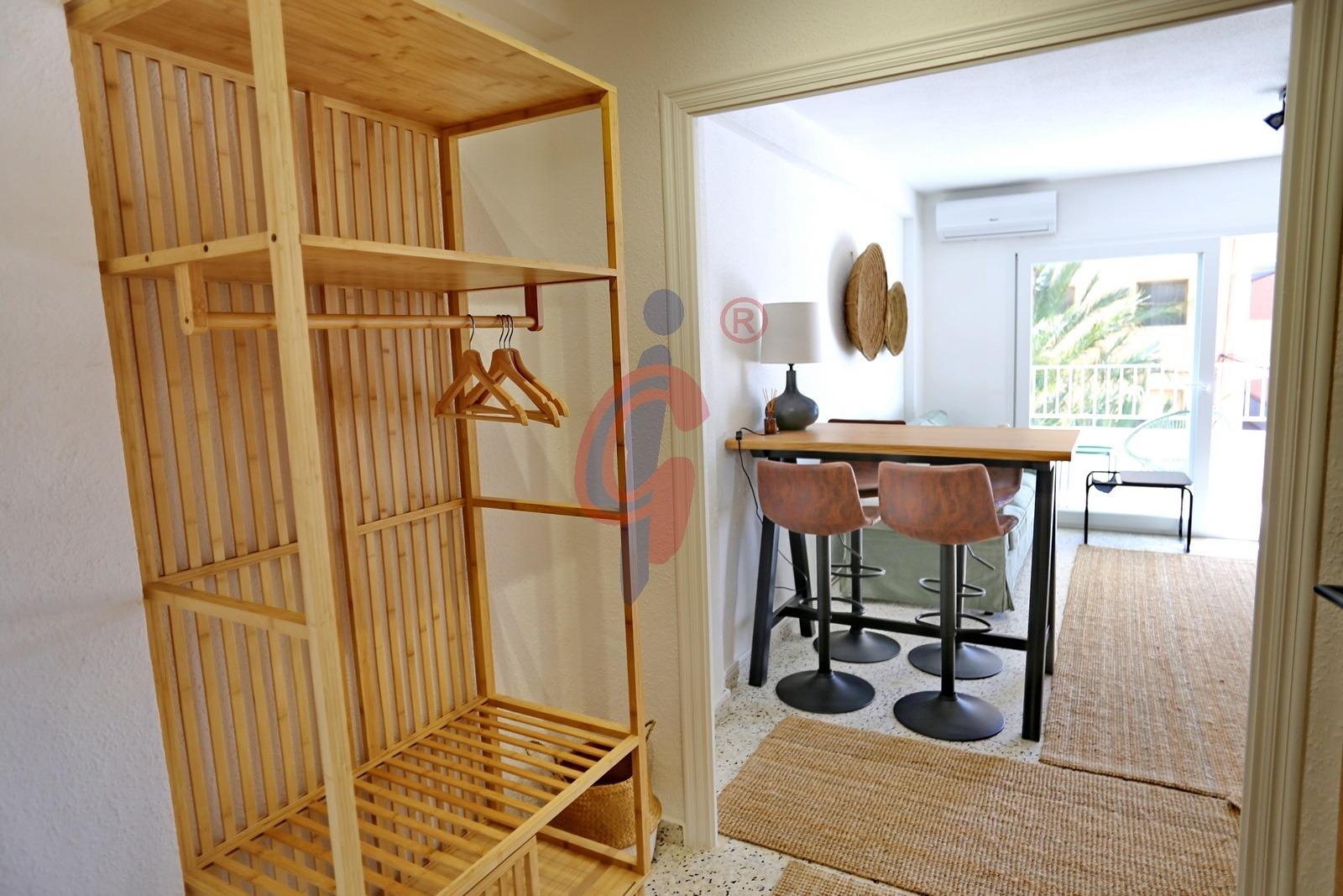 El apartamento dispone de un baño reformado, moderno y funcional. El dormitorio principal cuenta con una cama de gran tamaño y armario empotrado, mientras que el segundo dormitorio también dispone de armario. Además, el edificio cuenta con una pequeña ducha exterior, muy práctica para quienes regresan de la playa.