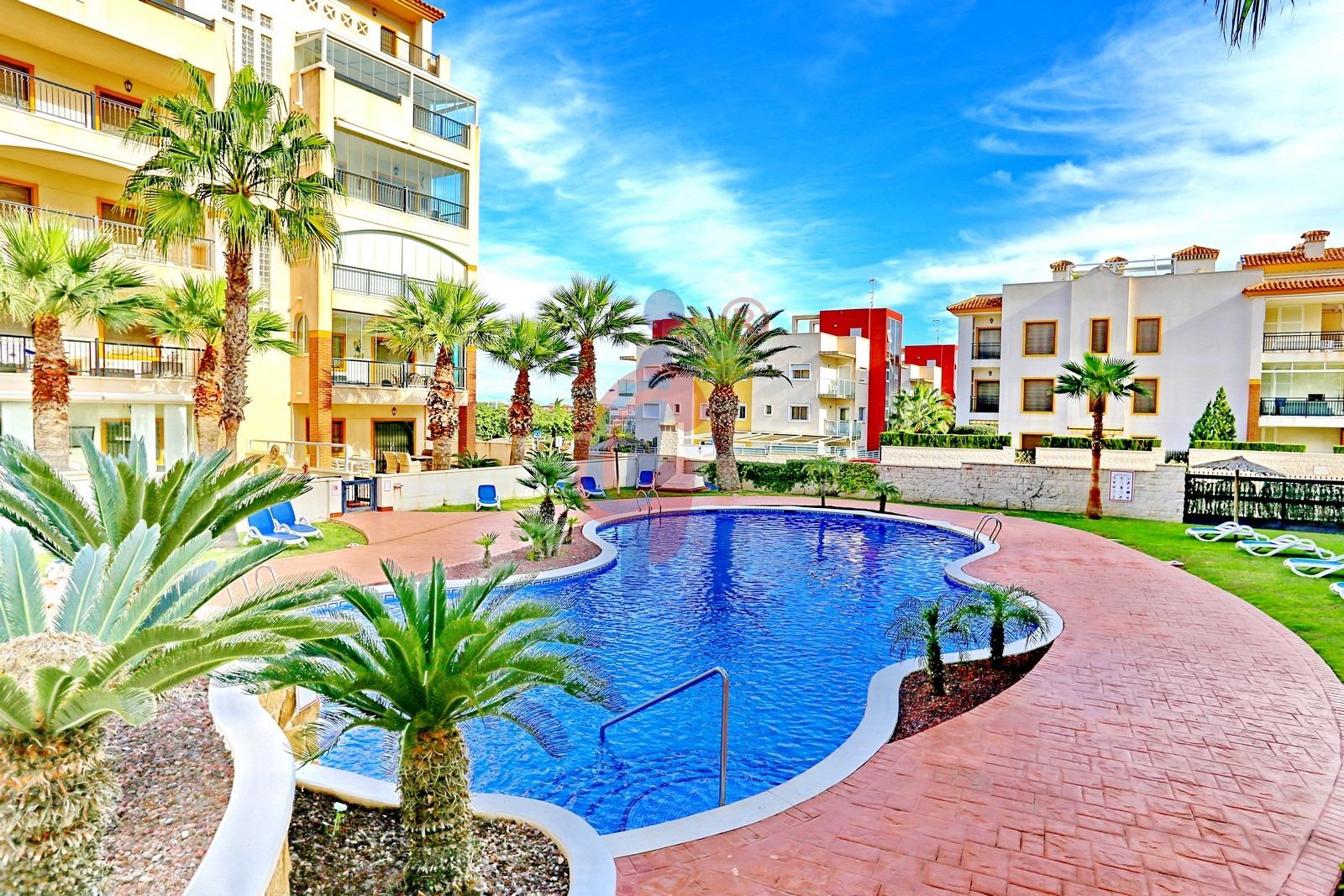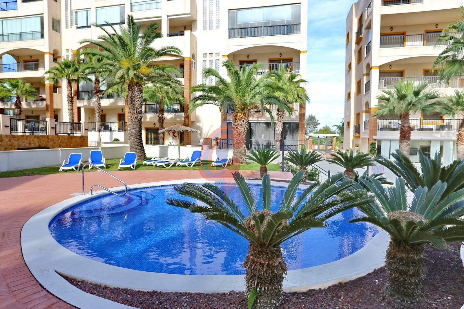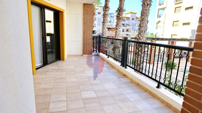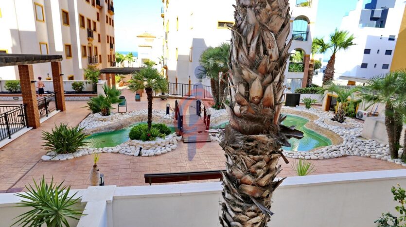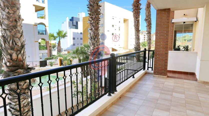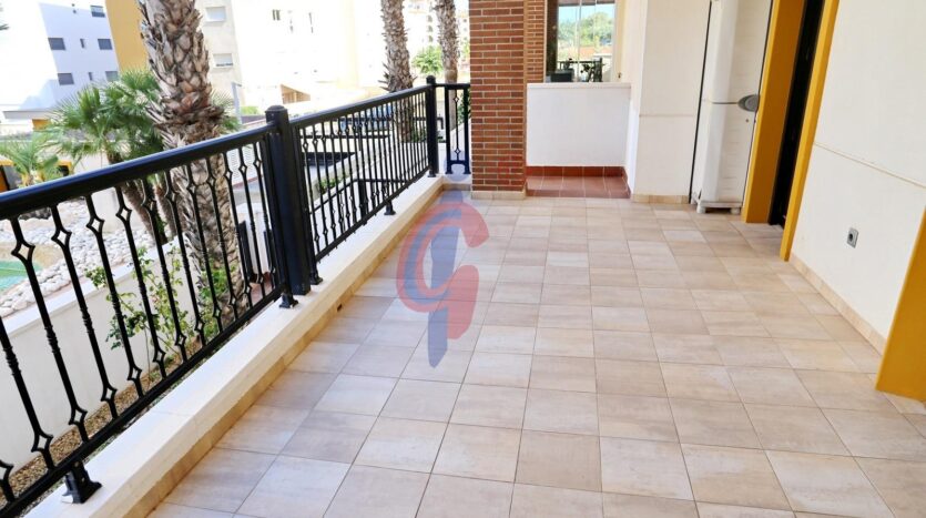 – Amplia terraza de más de 10 m2 con sol de mañana con vistas a la piscina y zonas comunes, además se ve un poquito el mar de fondo.