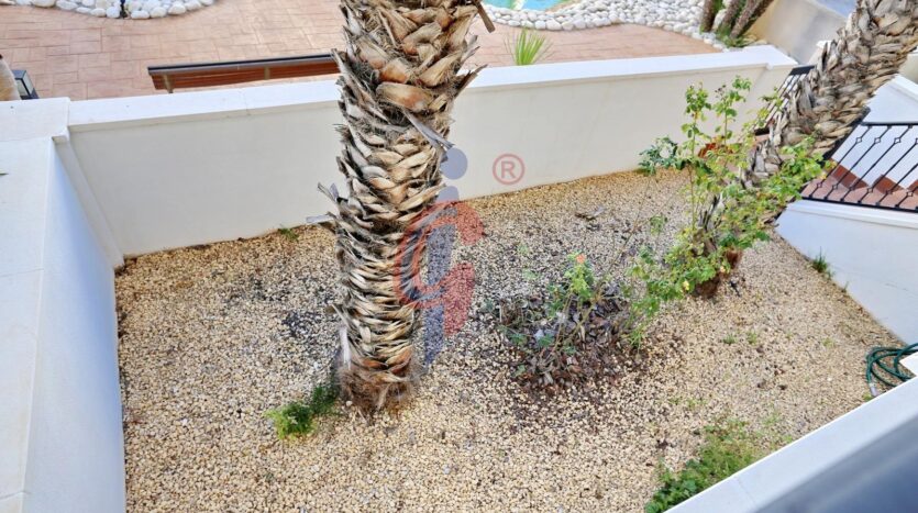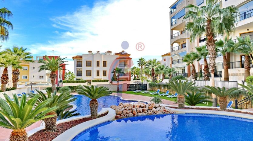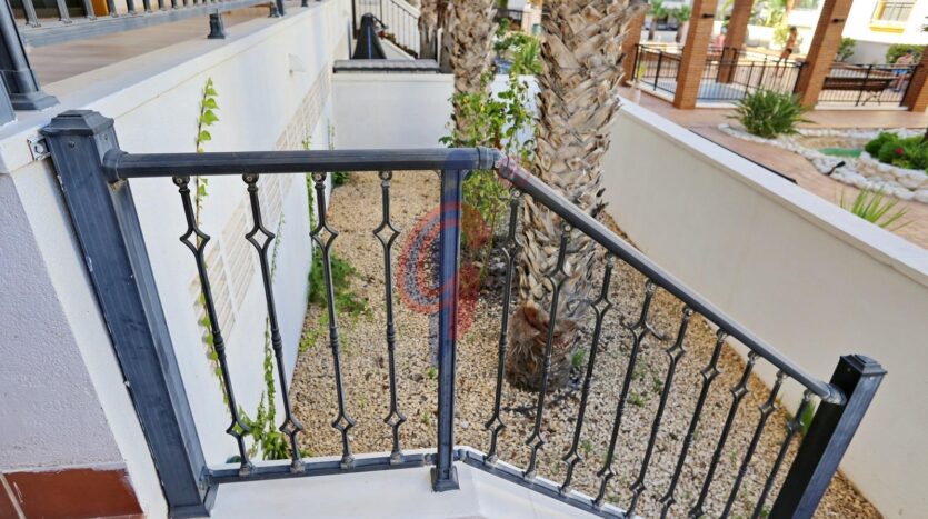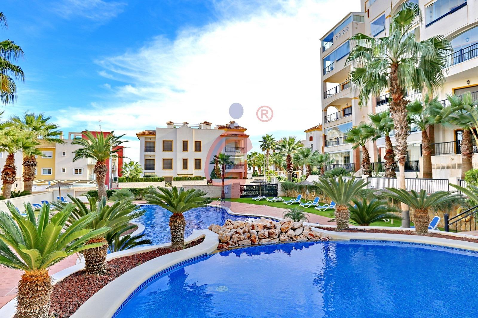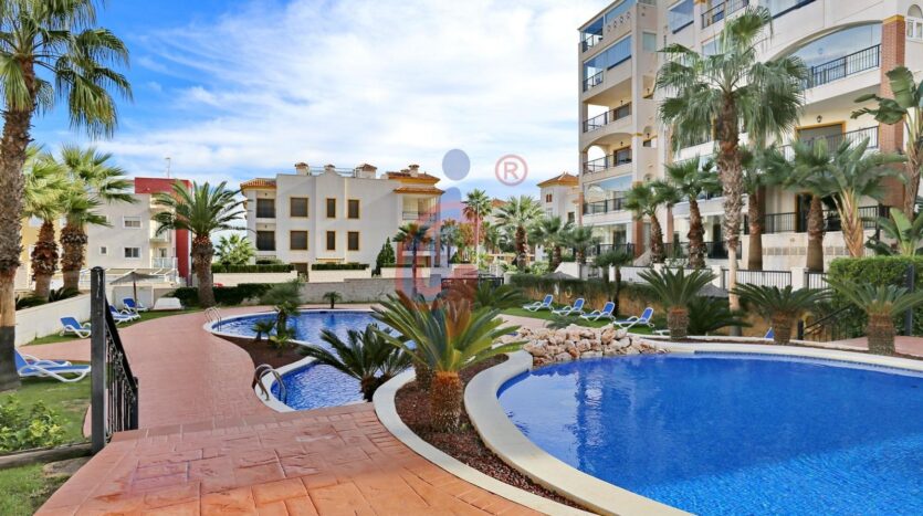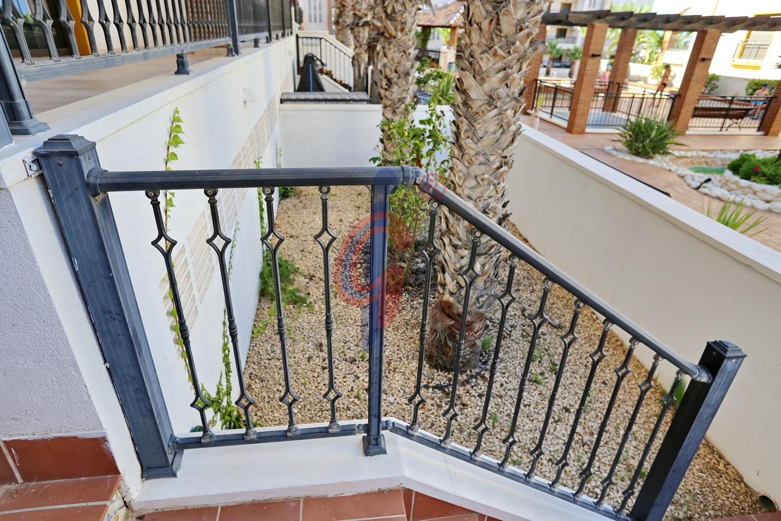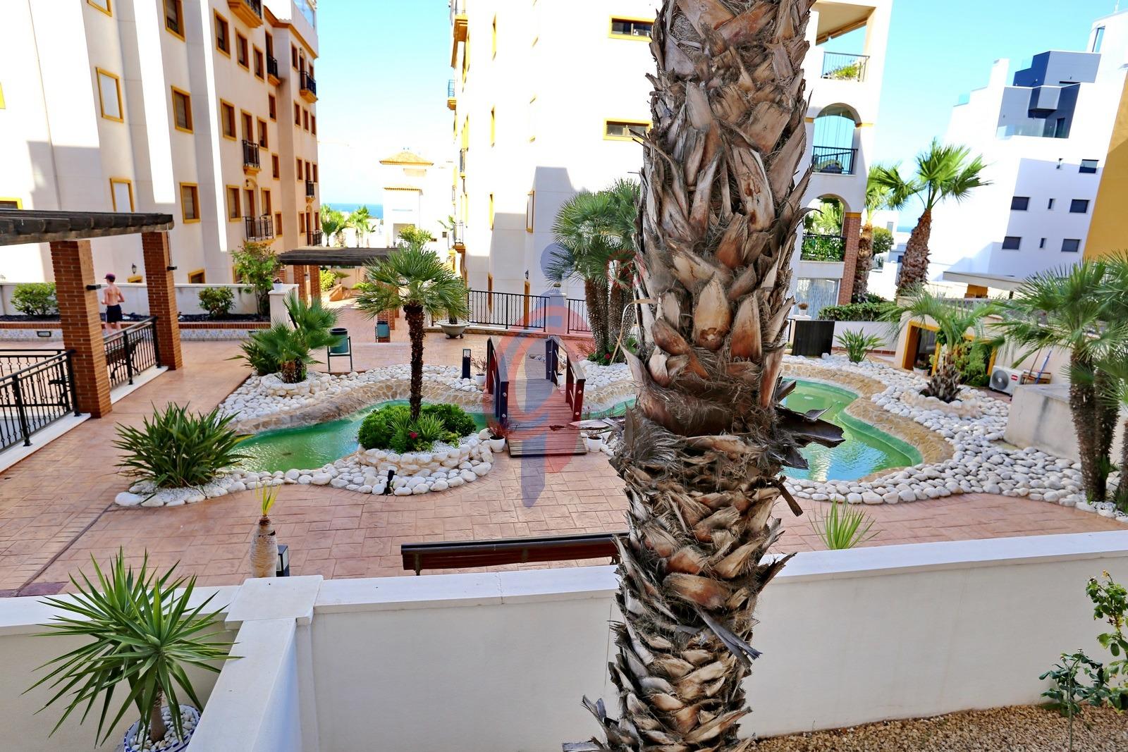 – Amplia terraza de más de 10 m2 con sol de mañana con vistas a la piscina y zonas comunes, además se ve un poquito el mar de fondo.