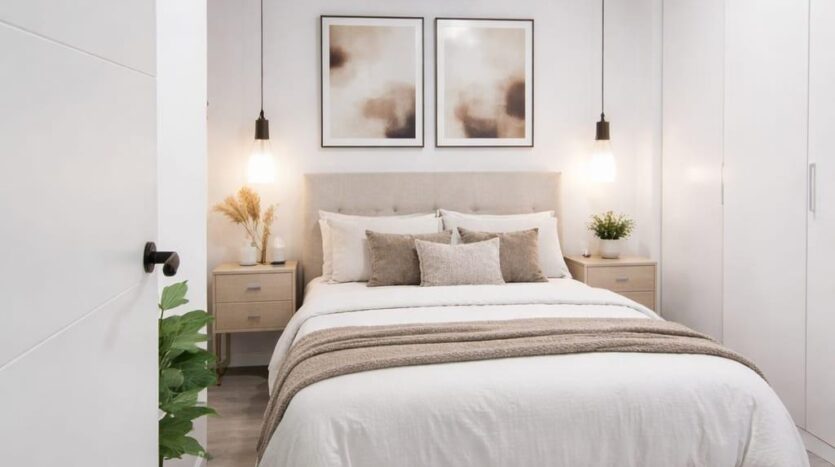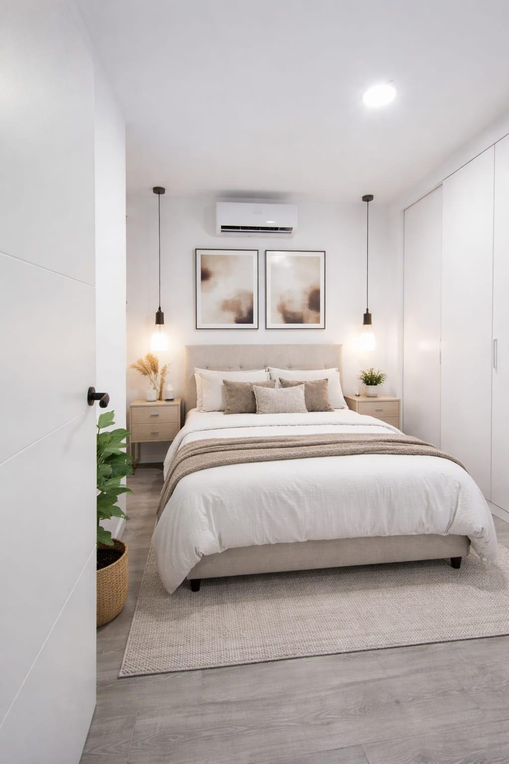 La vivienda dispone de tres dormitorios con ventilación natural al patio interior, dos de ellos con posibilidad de incorporar armarios empotrados. El baño es amplio y funcional, equipado con plato de ducha, lavabo e inodoro.